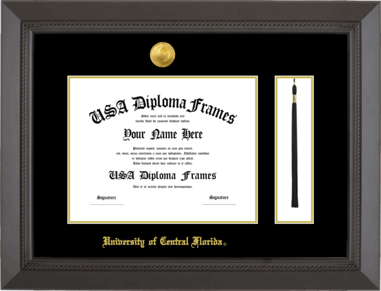University of Central Florida Diploma Frame with Tassel – For 8.5″x11″ Bachelor’s Degree – Black Rope – Black and Gold Mat with Medallion Seal