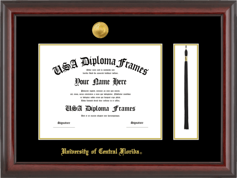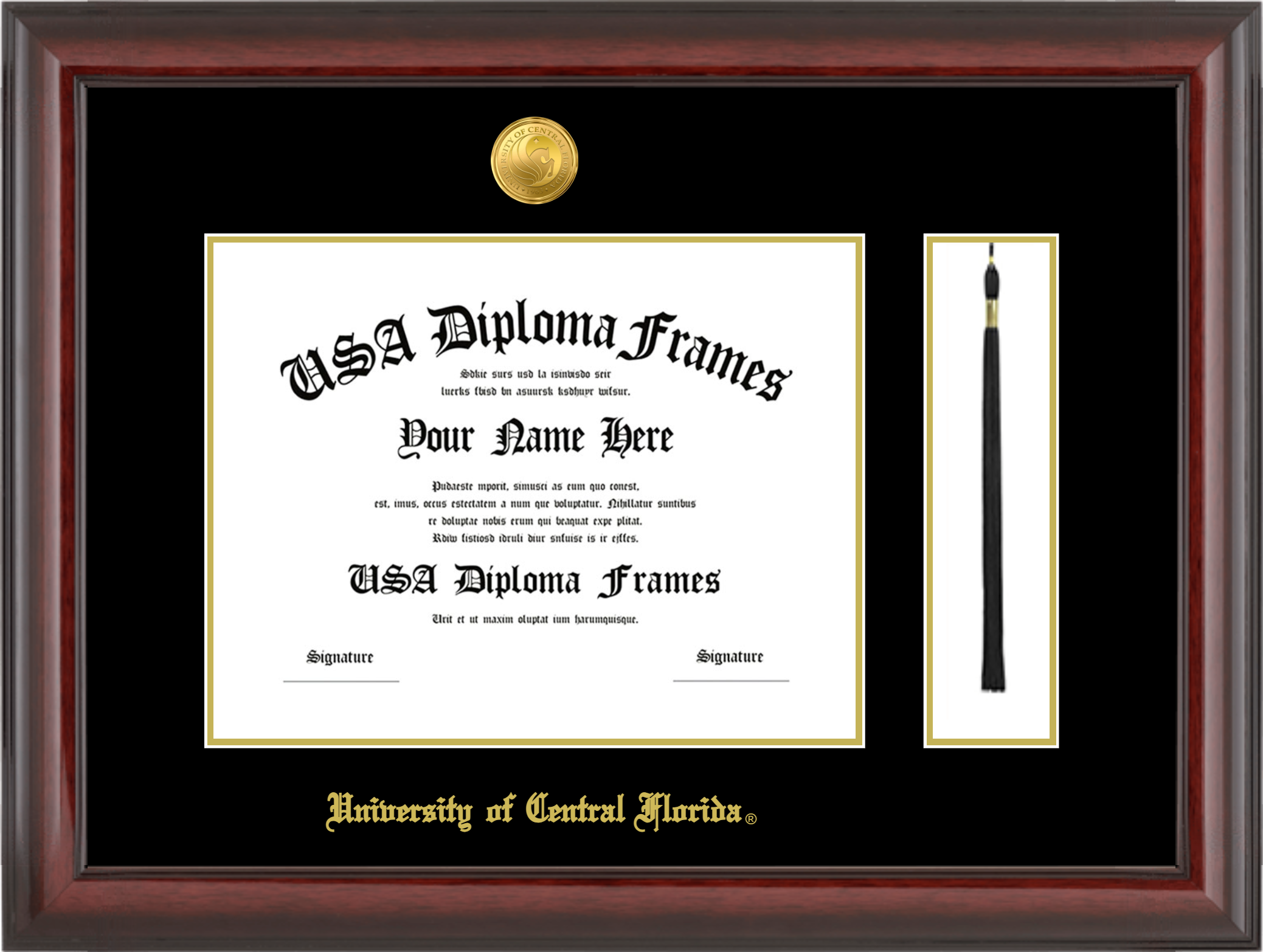 University of Central Florida Diploma Frame with Tassel – For 8.5″x11″ Bachelor’s Degrees – Cherry Glossy – Black Gold Mat with Medallion Seal