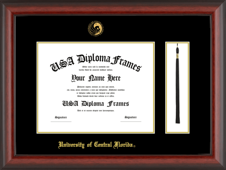 University of Central Florida Diploma Frame with Tassel – For 8.5″x11″ Bachelor’s Degrees – Cherry Mahogany Matte – Black Gold Mat with Seal