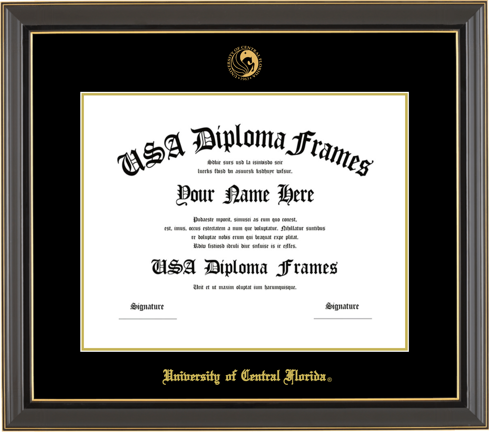 University of Central Florida Diploma Frame – Masters/PhD 11×14 – Black Gold Trim Glossy – Black and Gold Mat