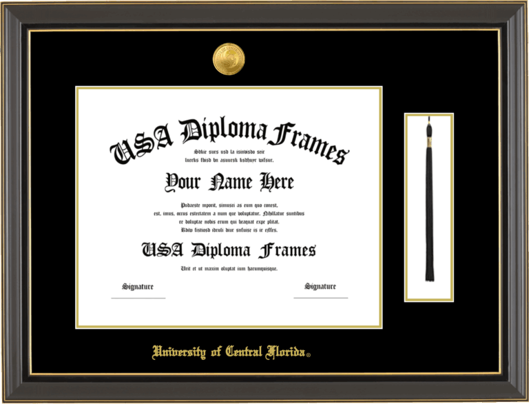 University of Central Florida Diploma Frame with Tassel – Masters/PhD 11×14 – Black Gold Trim Glossy – Black and Gold Mat – Gold Medallion