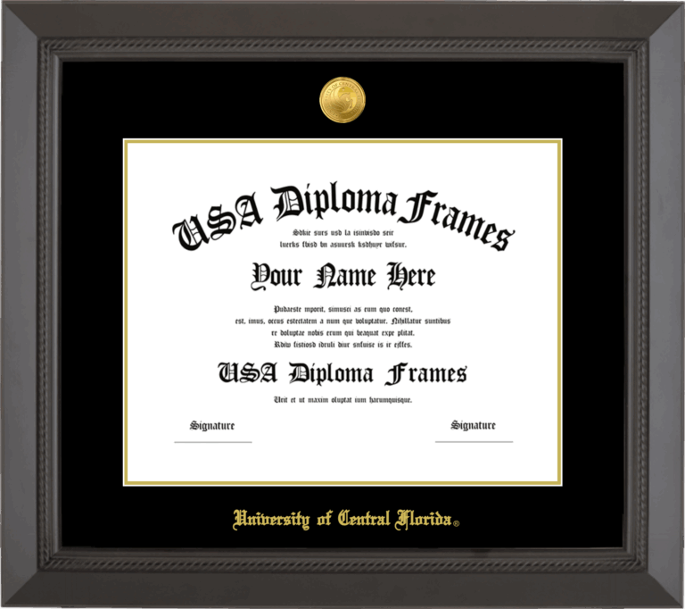 University of Central Florida Diploma Frame – Masters/PhD 11×14 – Black Rope – Black and Gold Mat – Gold Medallion