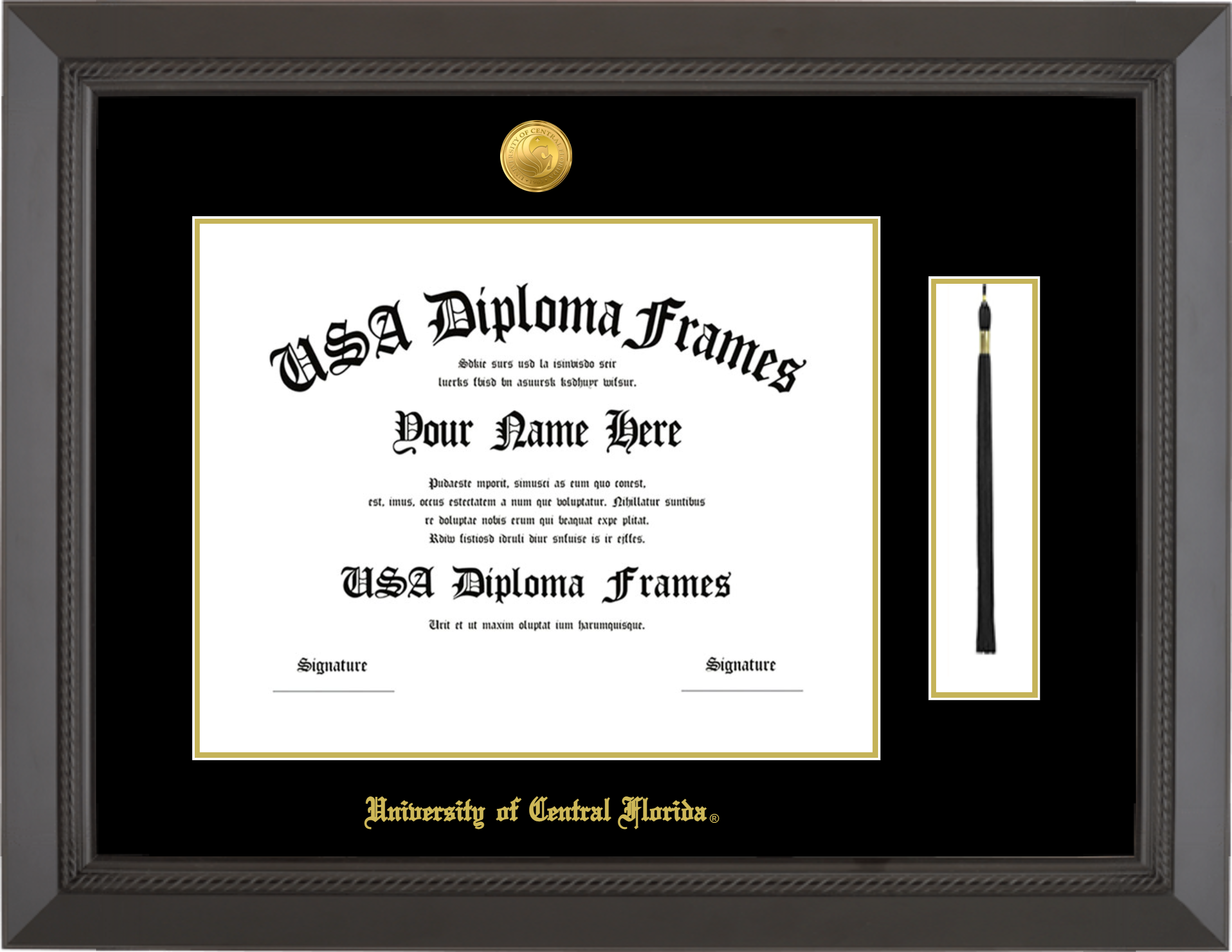 University of Central Florida Diploma Frame with Tassel – Masters/PhD 11×14 – Black Rope – Black and Gold Mat – Gold Medallion