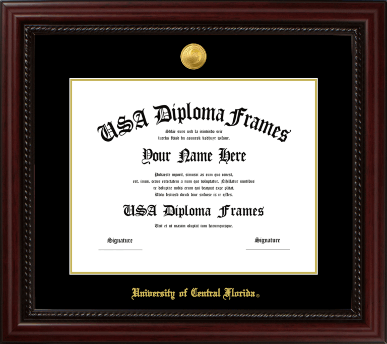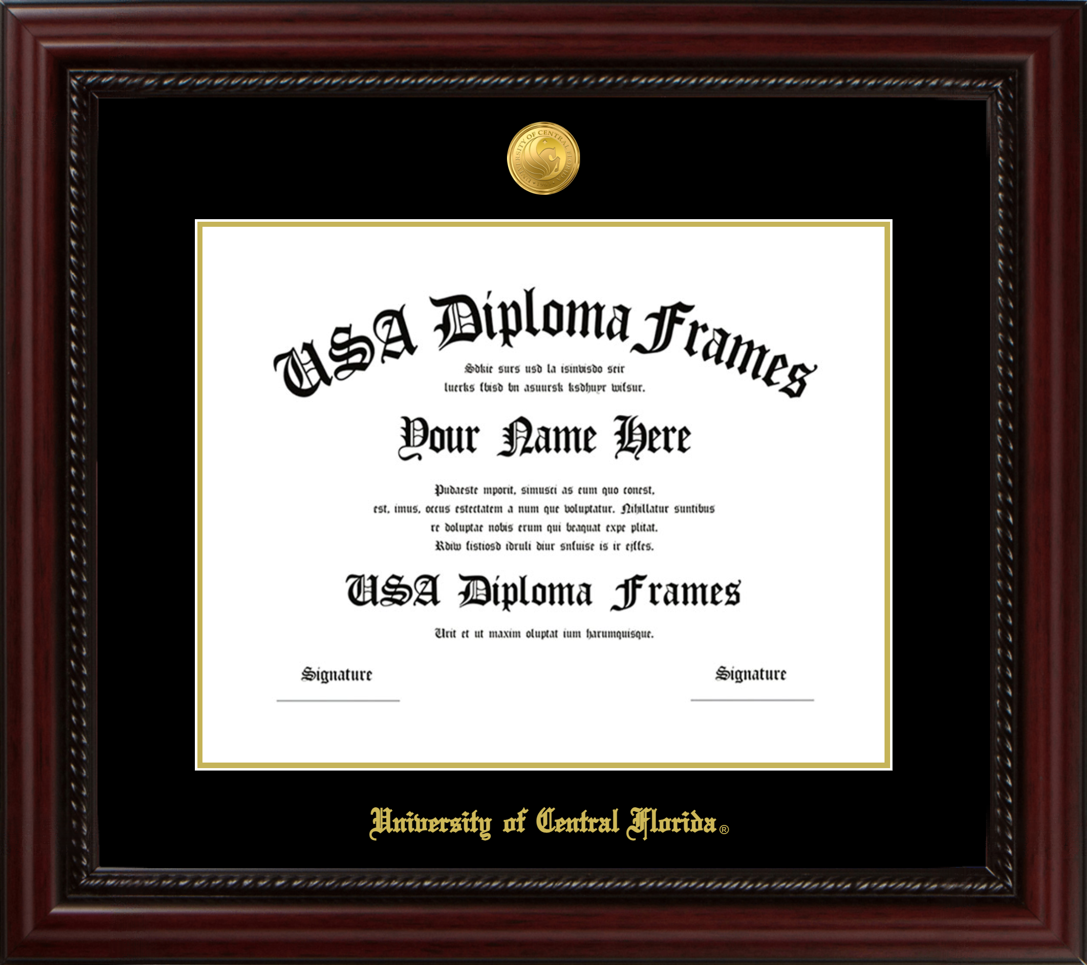 University of Central Florida Diploma Frame – Masters/PhD 11×14 – Executive Cherry Rope – Black and Gold Mat – Gold Medallion