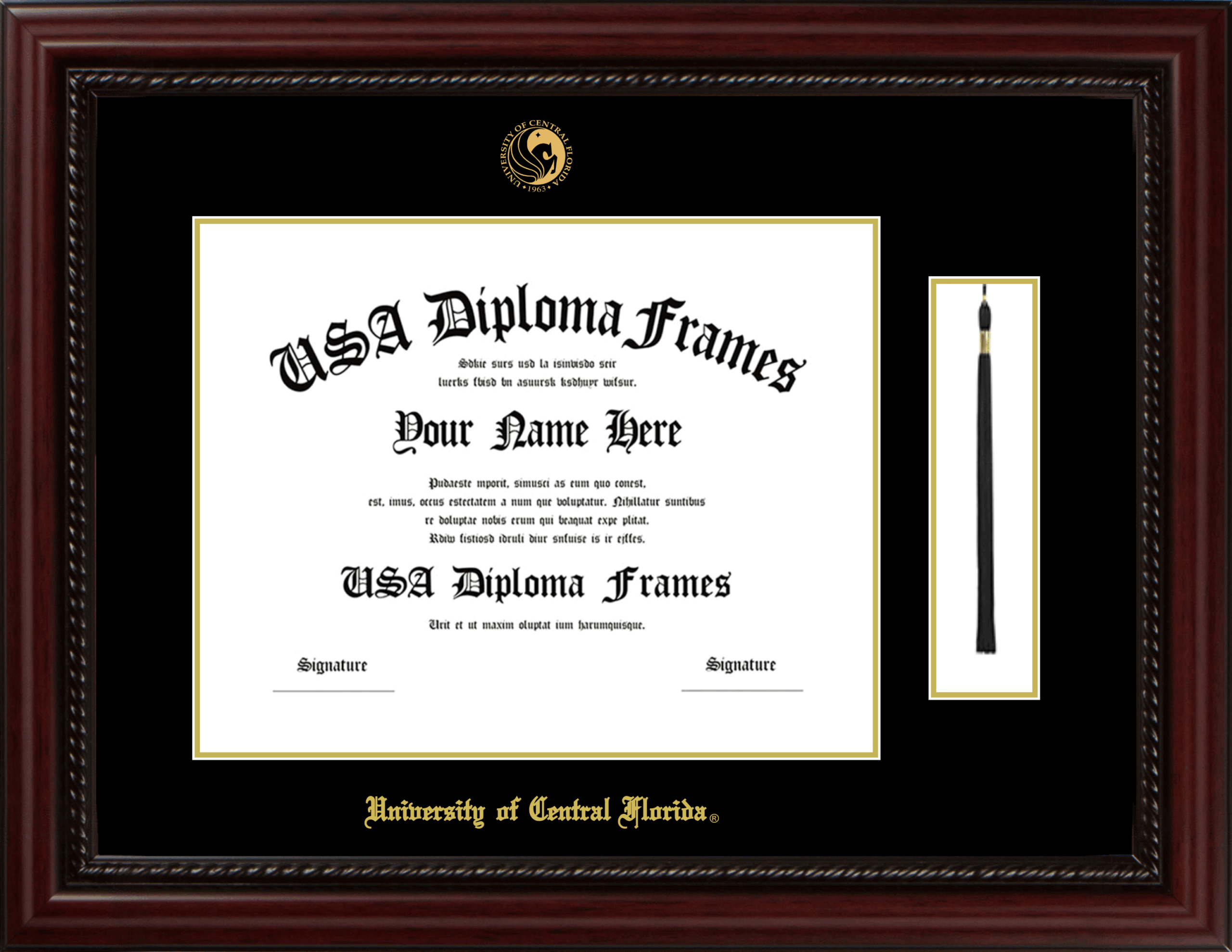University of Central Florida Diploma Frame with Tassel – Masters/PhD 11×14 – Executive Cherry Rope – Black and Gold Mat
