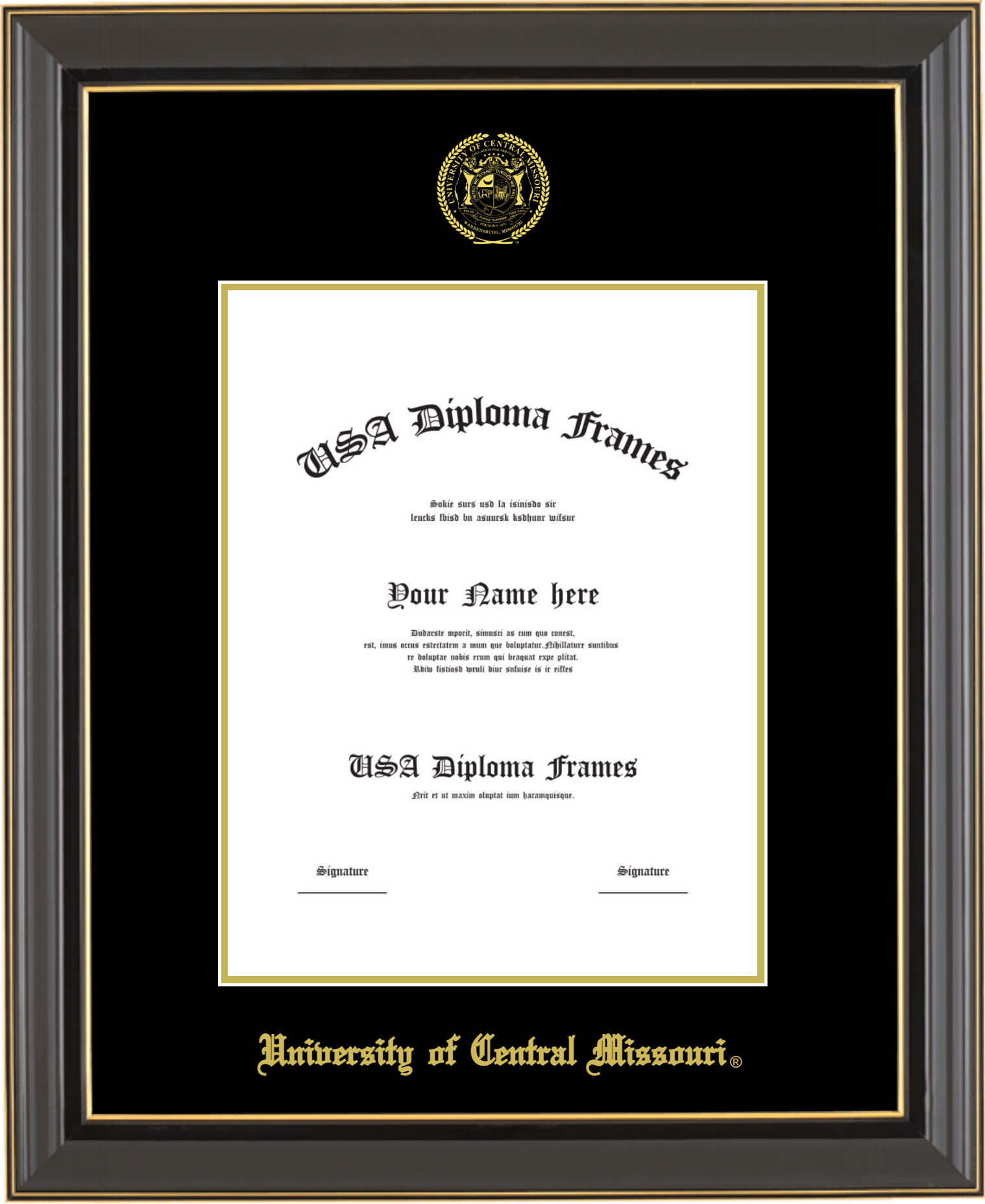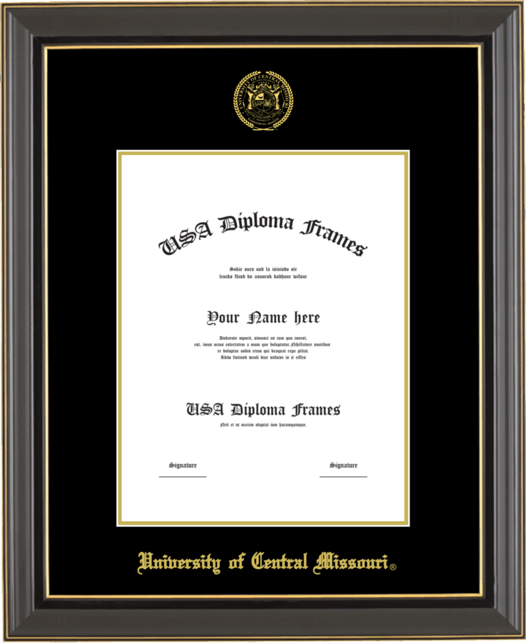 University of Central Missouri Diploma Frame – Black Gold Trim Glossy – Black and Gold Mat