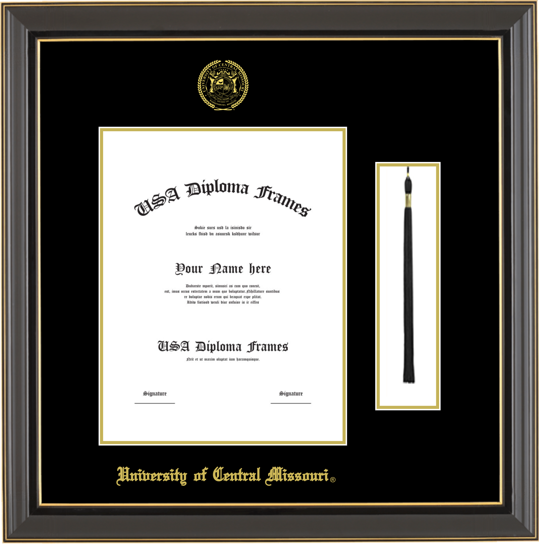 University of Central Missouri Diploma Frame with Tassel – Black Gold Trim Glossy – Black and Gold Mat
