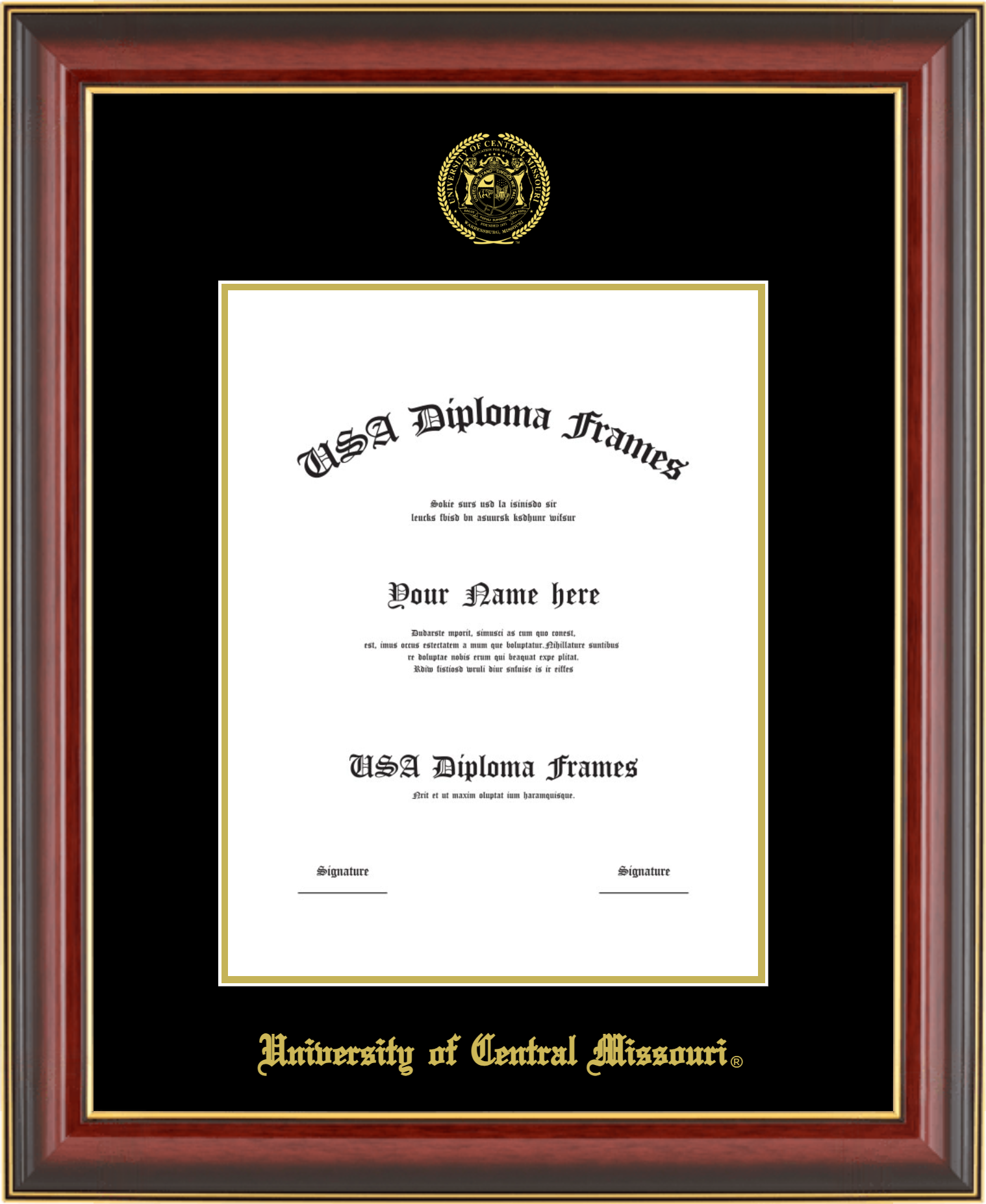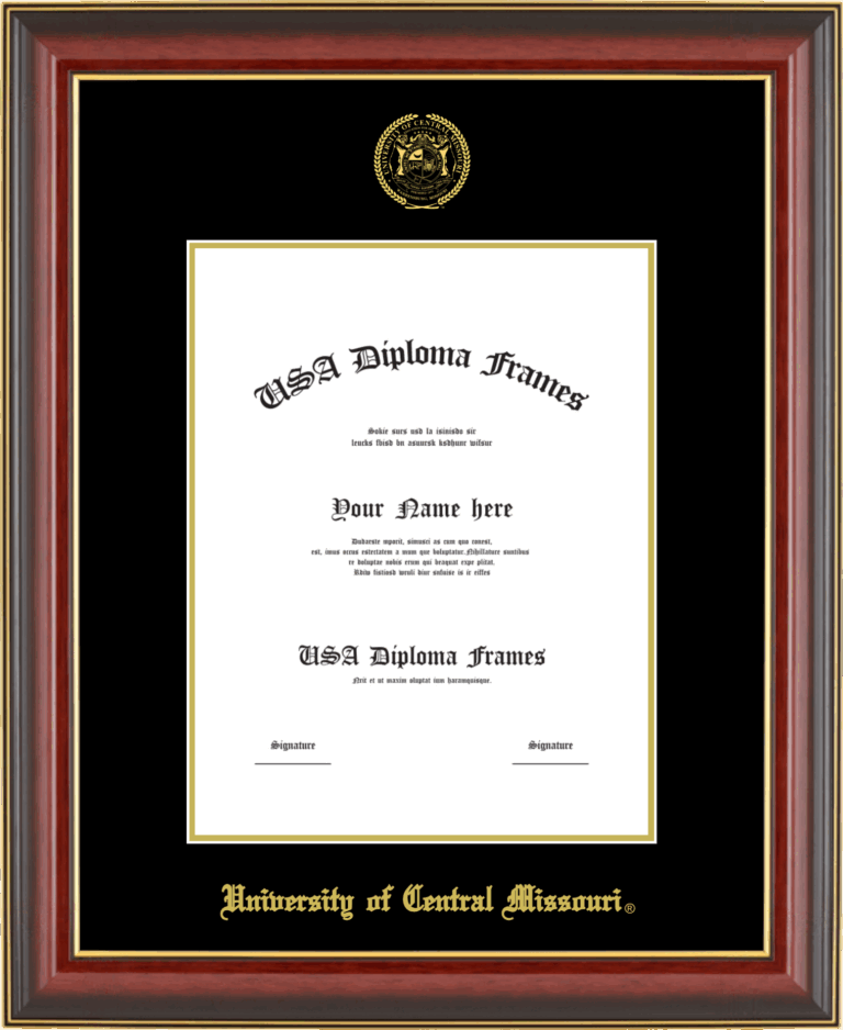 University of Central Missouri Diploma Frame – Cherry Mahogany Gold Trim Glossy – Black and Gold Mat