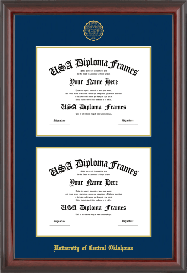 University of Central Oklahoma Double Diploma Frame – Double Document – Cherry Mahogany Glossy – Navy and Gold Mat