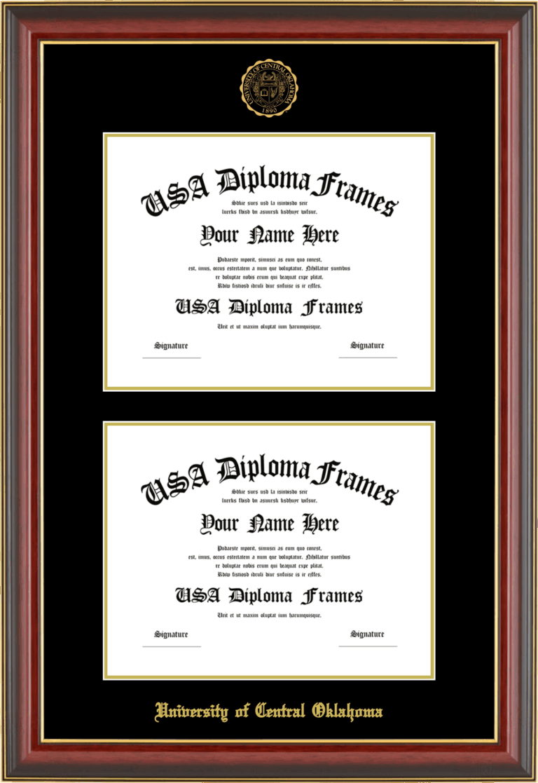 University of Central Oklahoma Double Diploma Frame – Double Document – Cherry Mahogany Gold Trim Glossy – Black and Gold Mat
