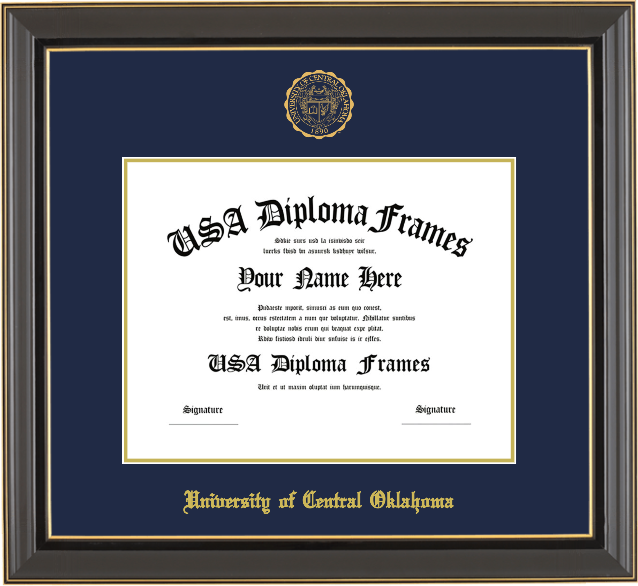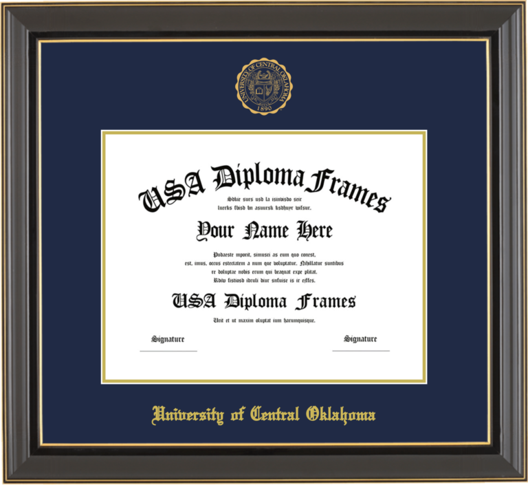 University of Central Oklahoma – Single Horizontal Document ( Diploma ) – Black Gold Trim Glossy – Navy Mat – Gold Accent Mat – With Seal(University Seal Gold) – With Gold Embossing (University of Central Oklahoma)