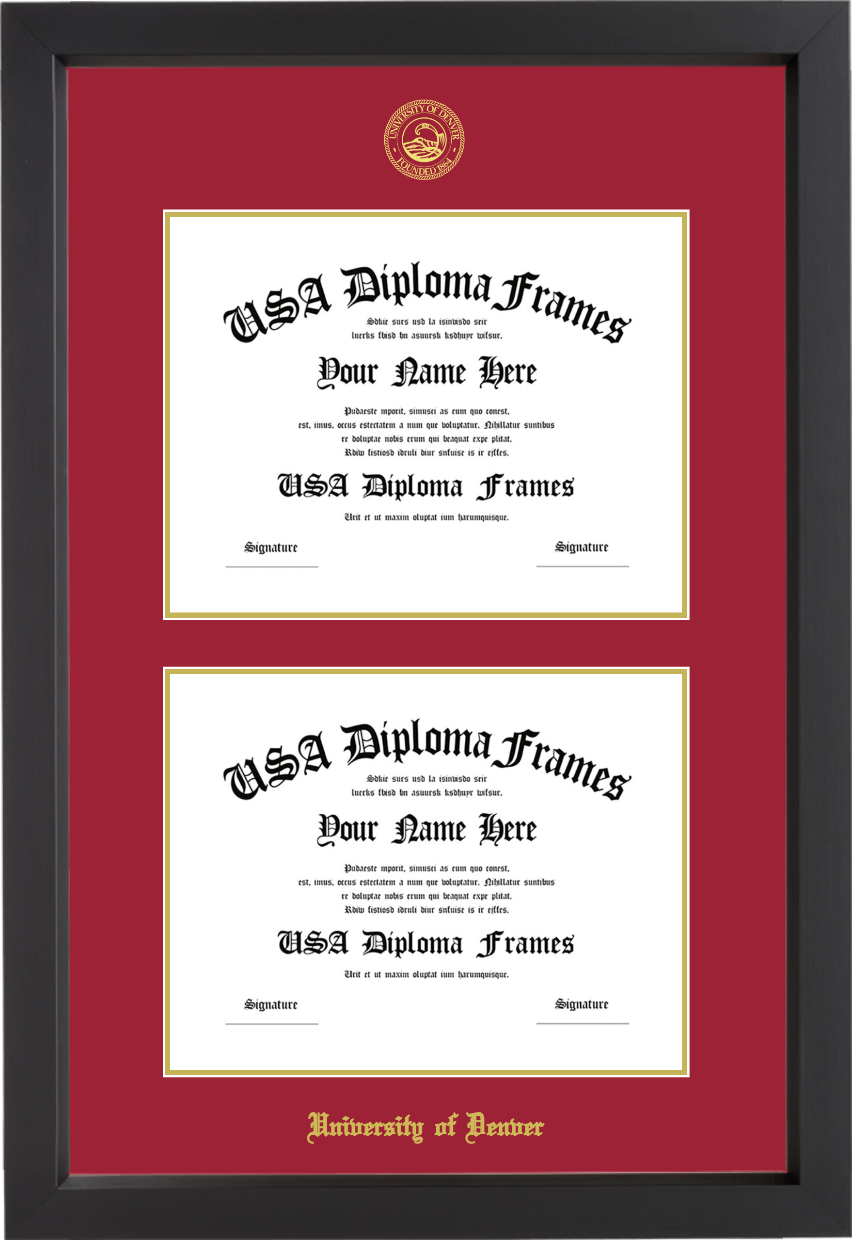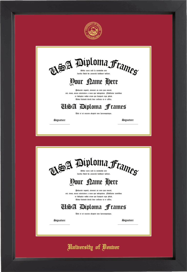 University of Denver Double Diploma Frame – Double Document – Black Matte – Crimson and Gold Mat