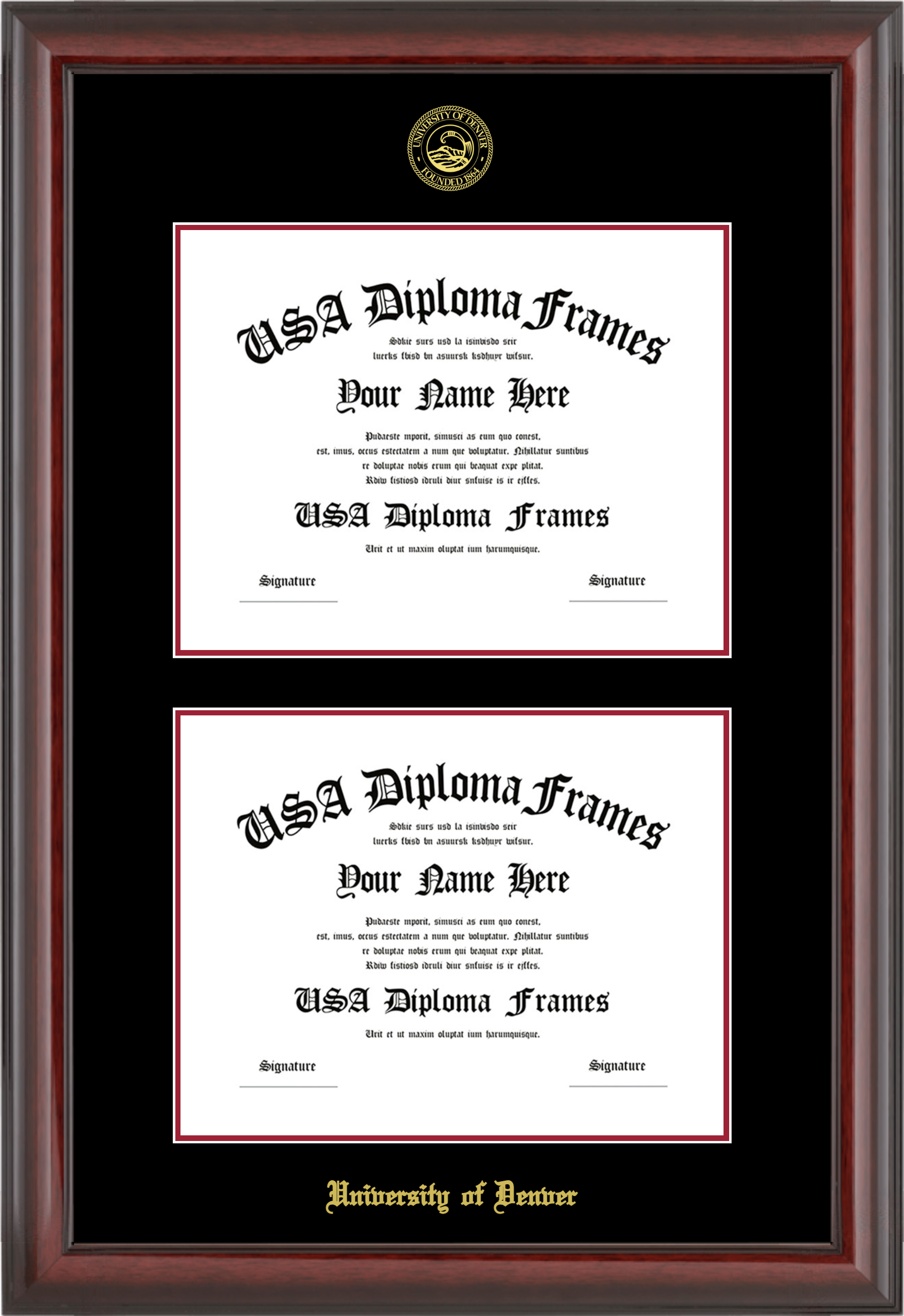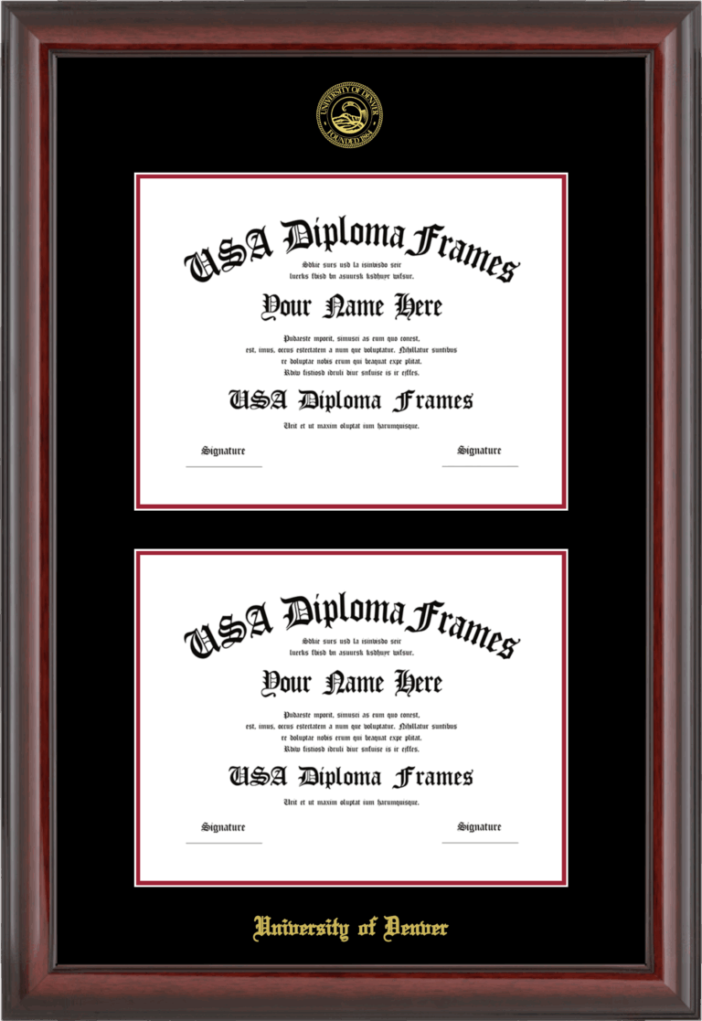University of Denver Double Diploma Frame – Double Document – Cherry Mahogany Glossy – Black and Crimson Mat