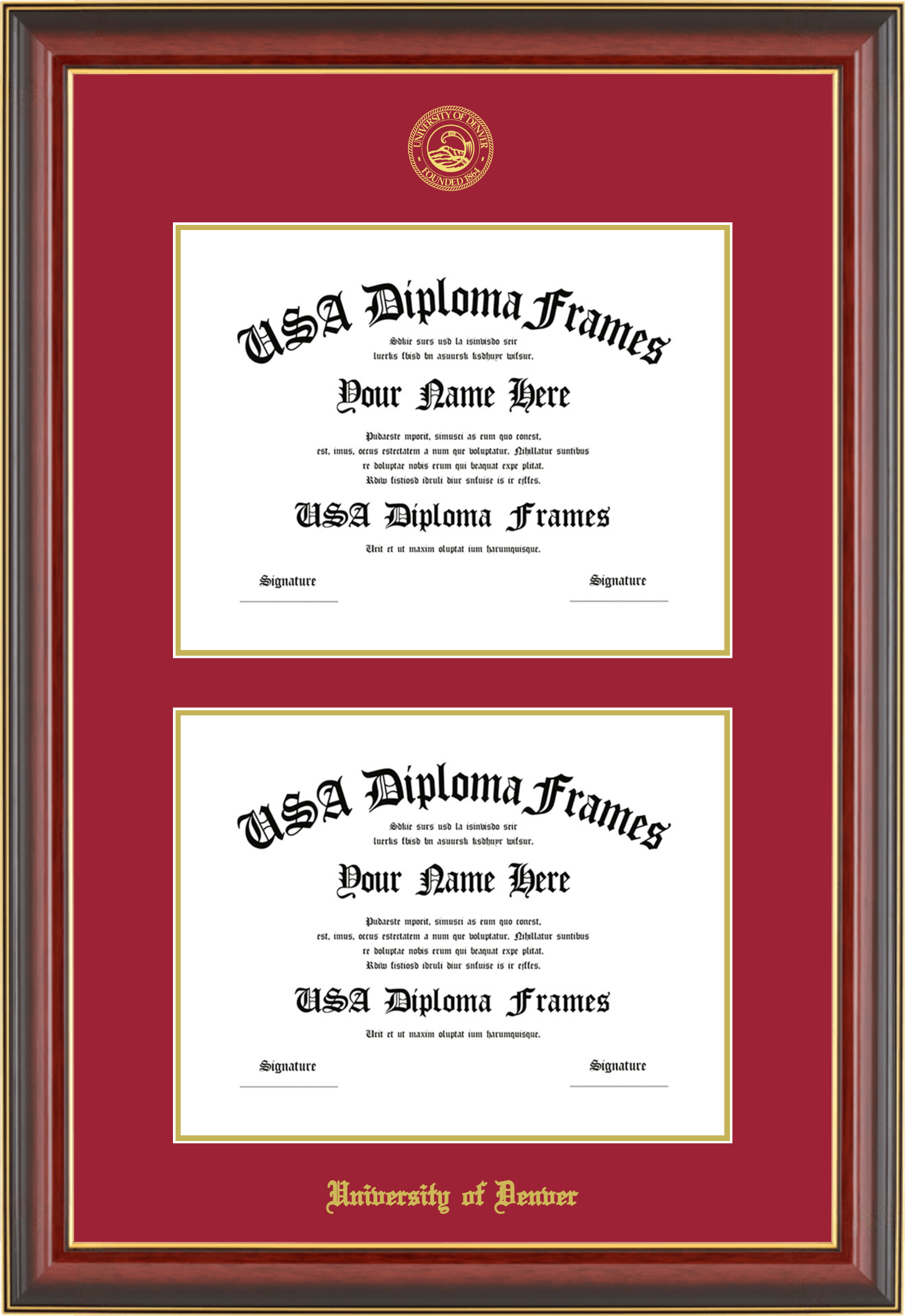 University of Denver Double Diploma Frame – Double Document – Cherry Mahogany Gold Trim Glossy – Crimson and Gold Mat