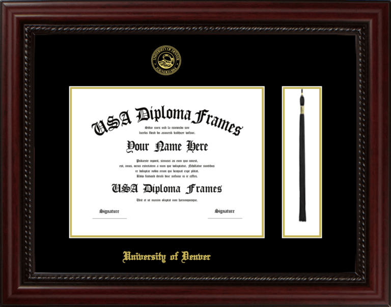 University of Denver Diploma Frame with Tassel – Executive Cherry Rope – Black and Gold Mat