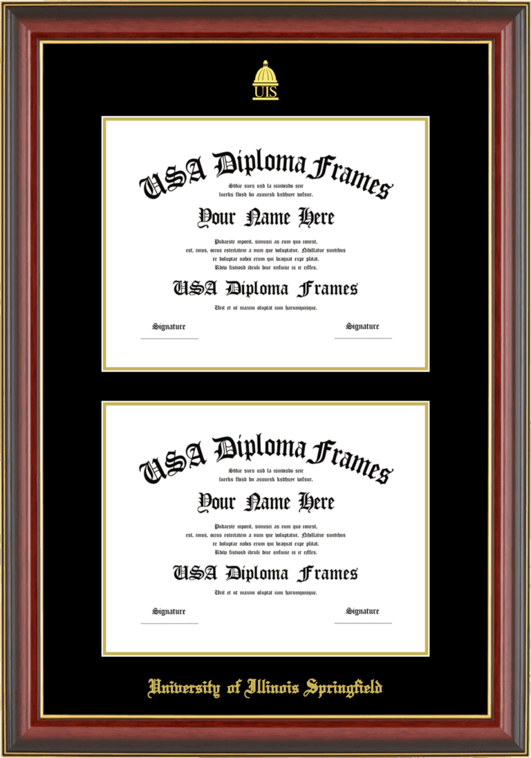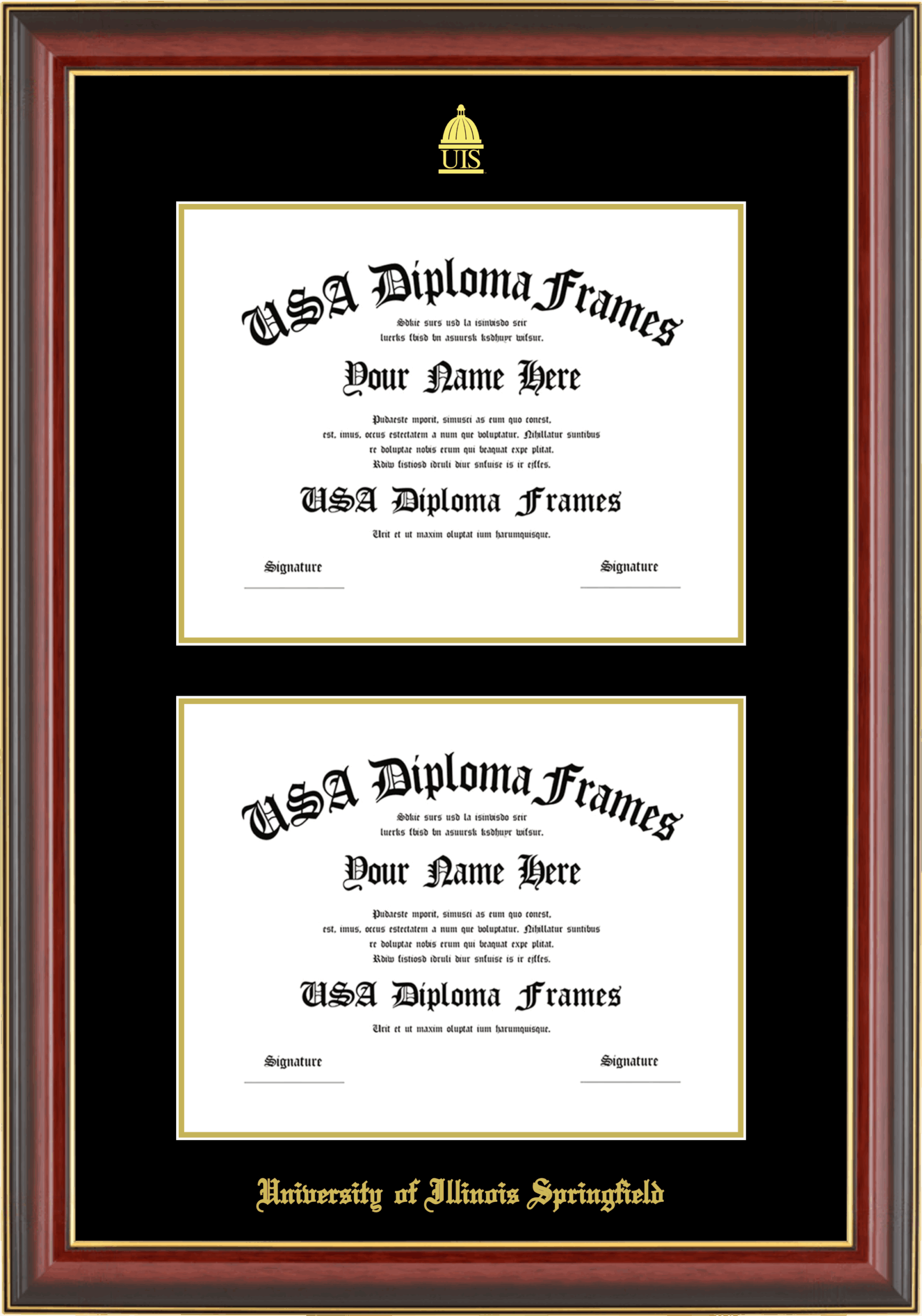 University of Illinois Springfield Double Diploma Frame – Double Document – Cherry Mahogany Gold Trim Glossy – Black and Gold Mat