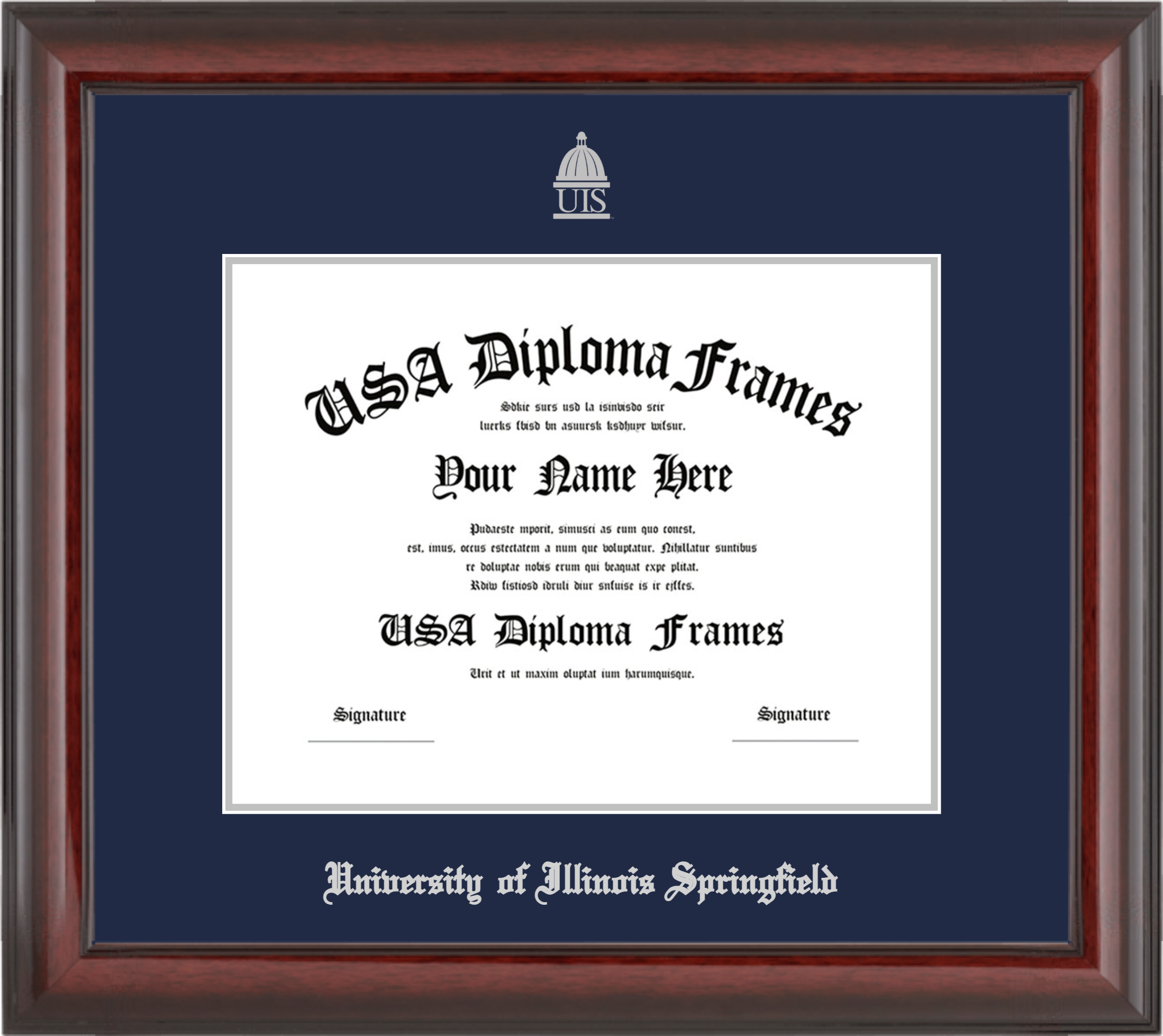 University of Illinois at Springfield – Single Horizontal Document ( Diploma ) – Cherry Mahogany Glossy – Navy Mat – Silver Accent Mat – With Seal(University Seal Silver) – With Silver Embossing (University of Illinois Springfield)