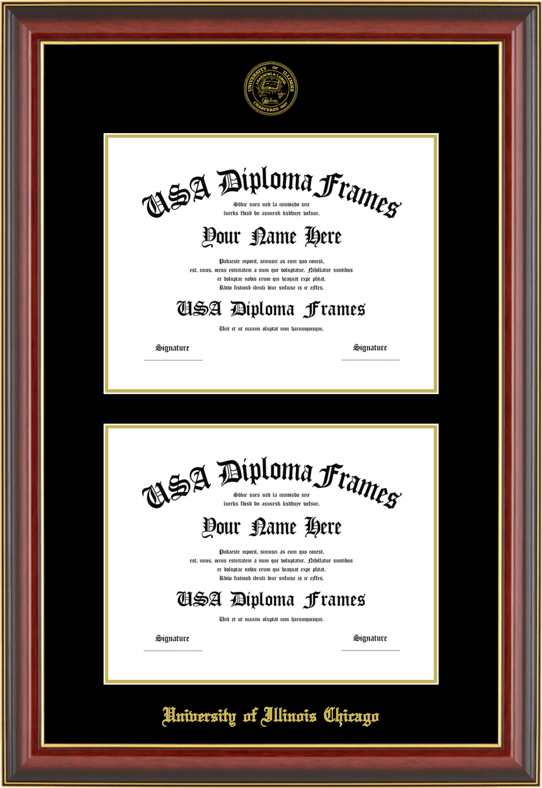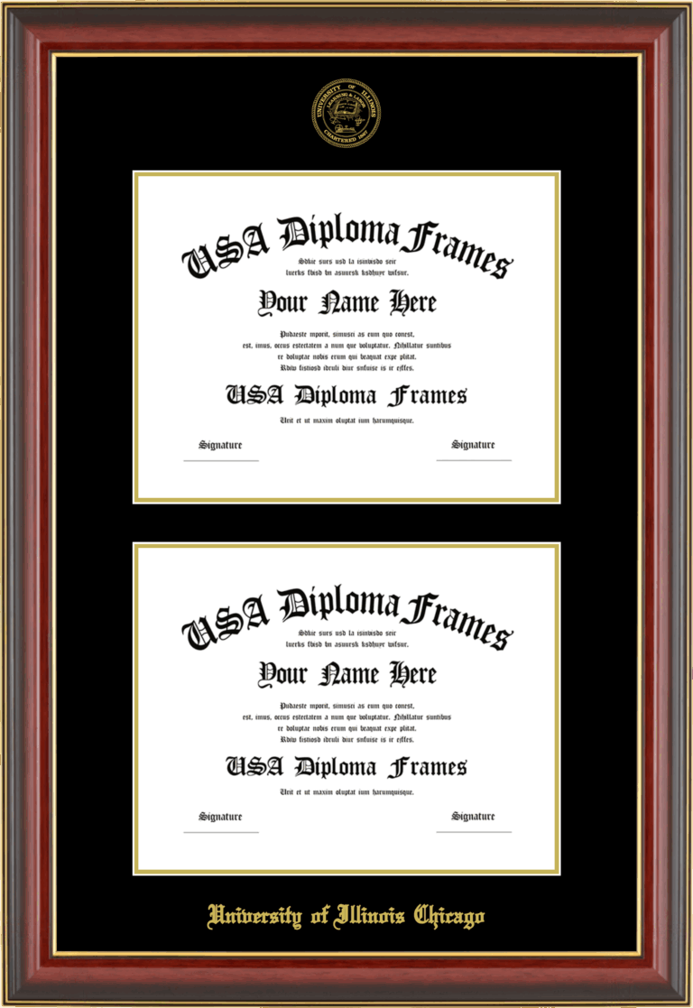 University of Illinois Chicago Double Diploma Frame – Double Document – Cherry Mahogany Gold Trim Glossy – Black and Gold Mat