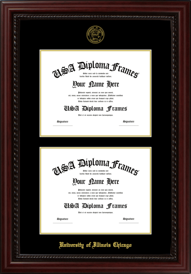 University of Illinois Chicago Double Diploma Frame – Double Document – Executive Cherry Rope – Black and Gold Mat