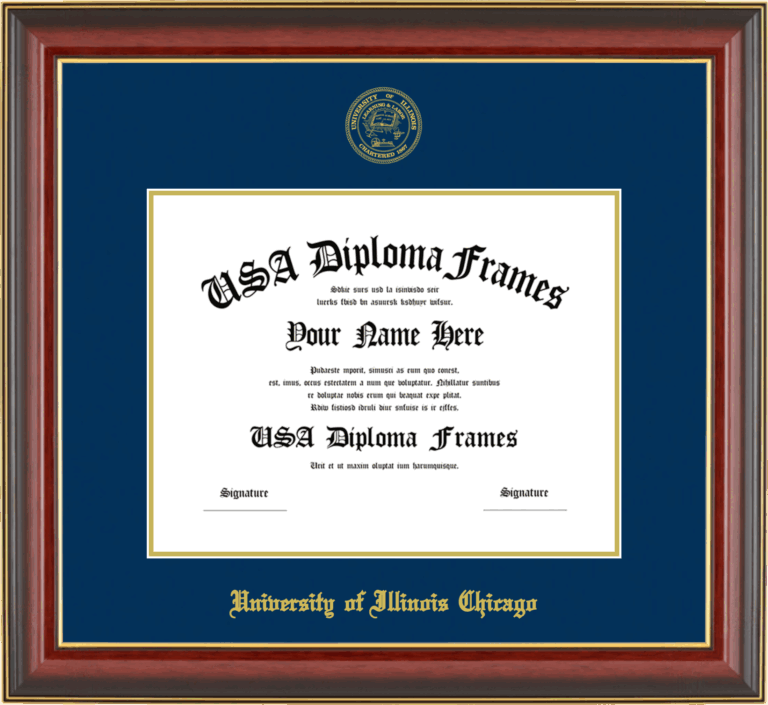 University of Illinois Chicago Diploma Frame – Cherry Mahogany Gold Trim Glossy – Navy and Gold Mat