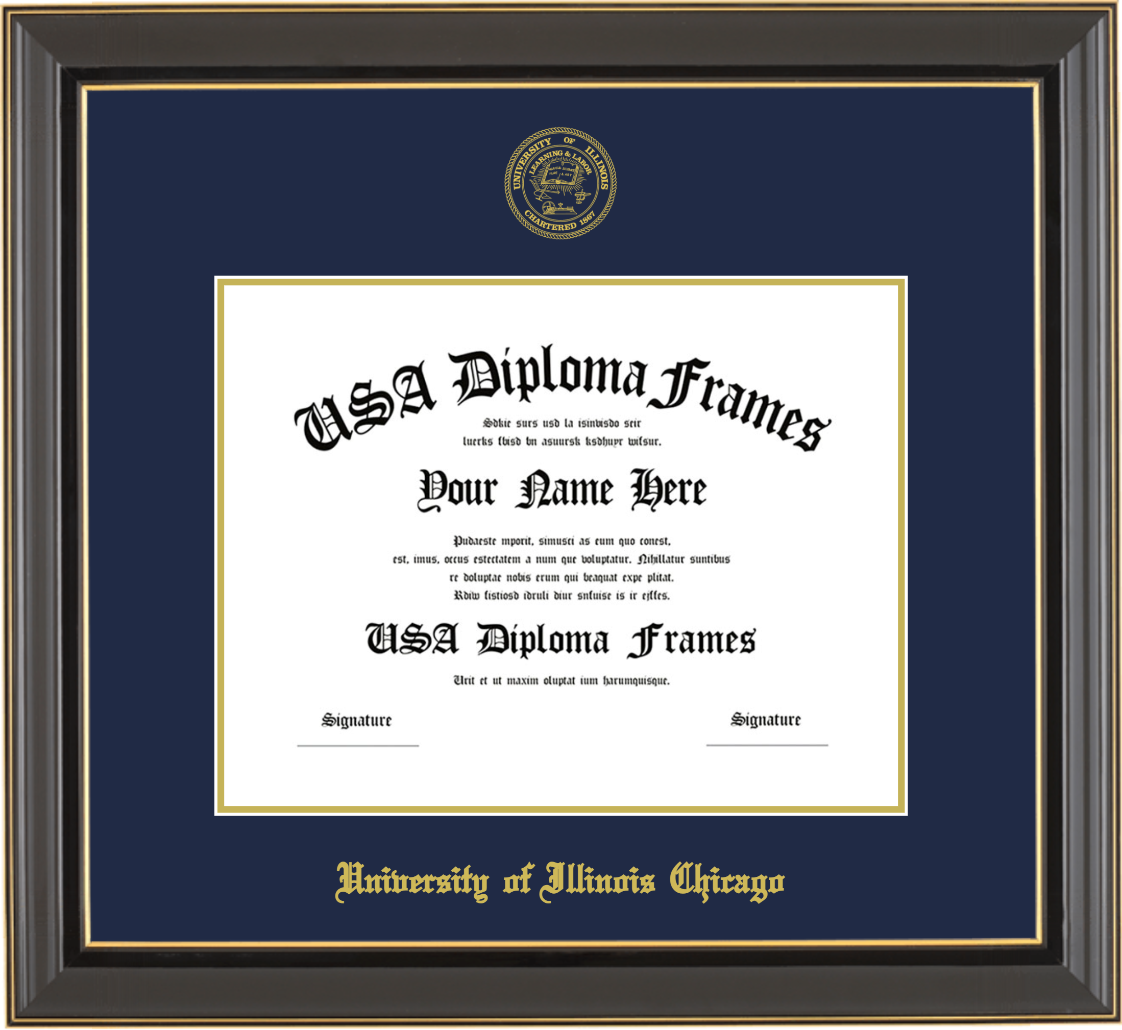 University of Illinois Chicago – Single Horizontal Document ( Diploma ) – Black Gold Trim Glossy – Navy Mat – Gold Accent Mat – With Seal(University Seal Gold) – With Gold Embossing (University of Illinois Chicago)