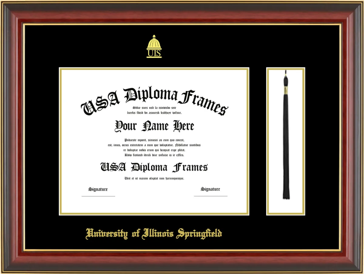 University of Illinois Springfield Diploma Frame with Tassel – Cherry Mahogany Gold Trim Glossy – Black and Gold Mat