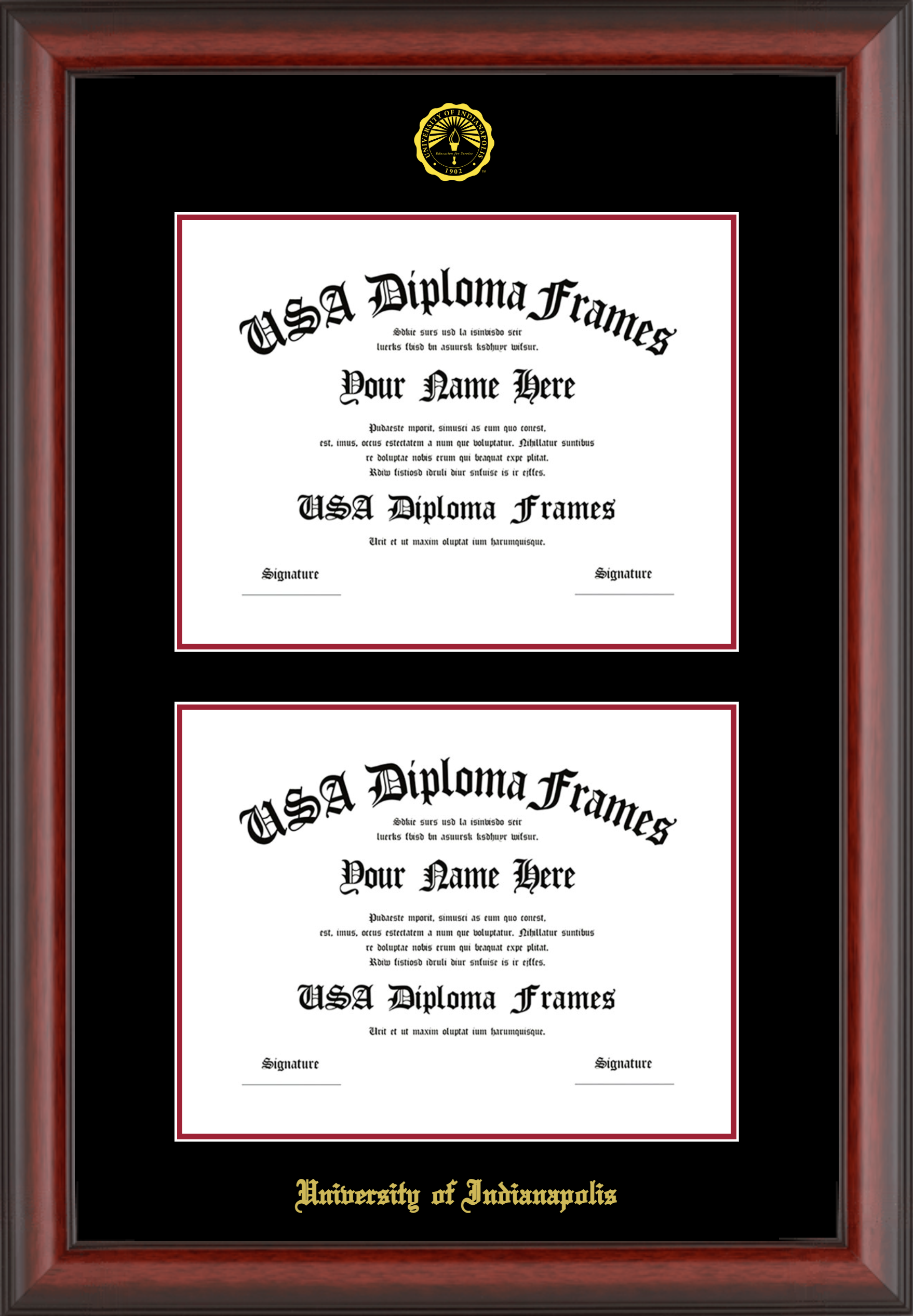 University of Indianapolis Double Diploma Frame – Double Document – Cherry Mahogany Matte – Black and Crimson Mat