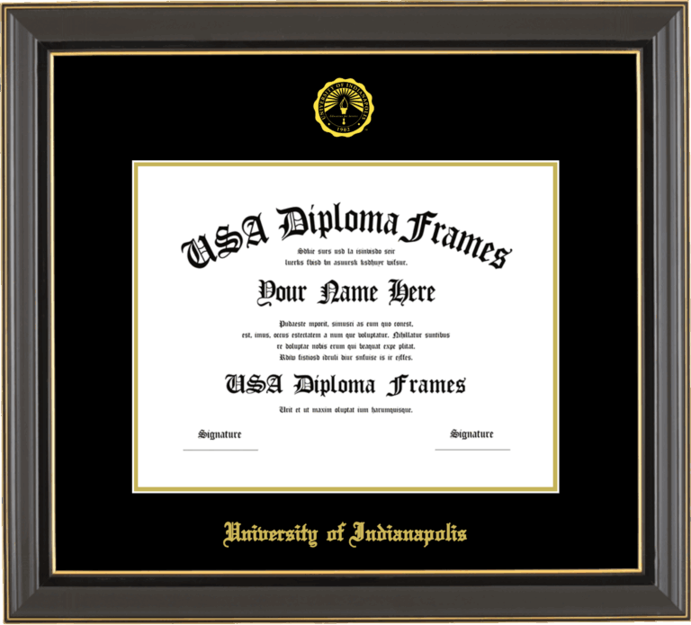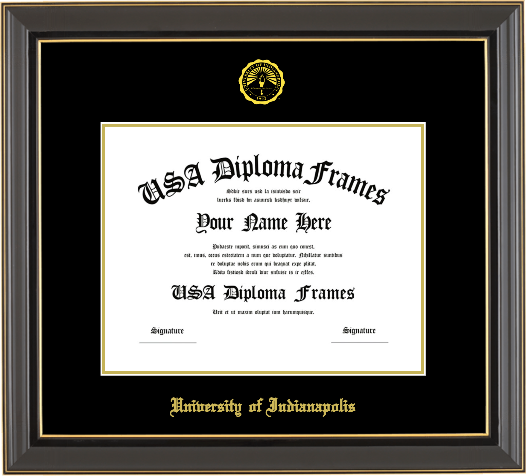 University of Indianapolis Diploma Frame – Black Gold Trim Glossy – Black and Gold Mat