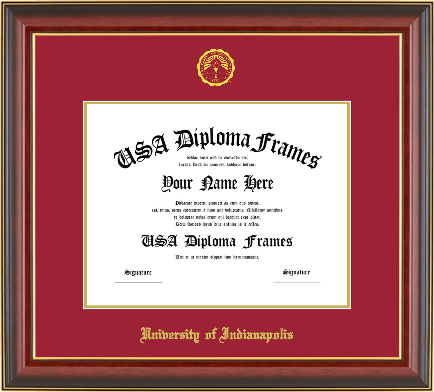 University of Indianapolis Diploma Frame – Cherry Mahogany Gold Trim Glossy – Crimson and Gold Mat