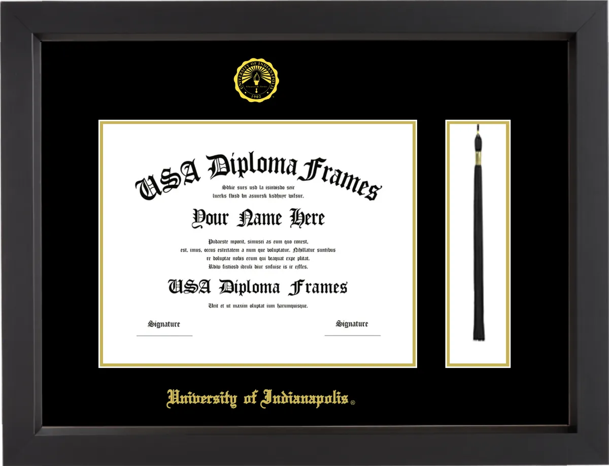 University of Indianapolis Diploma Frame with Tassel – Black Matte – Black and Gold Mat