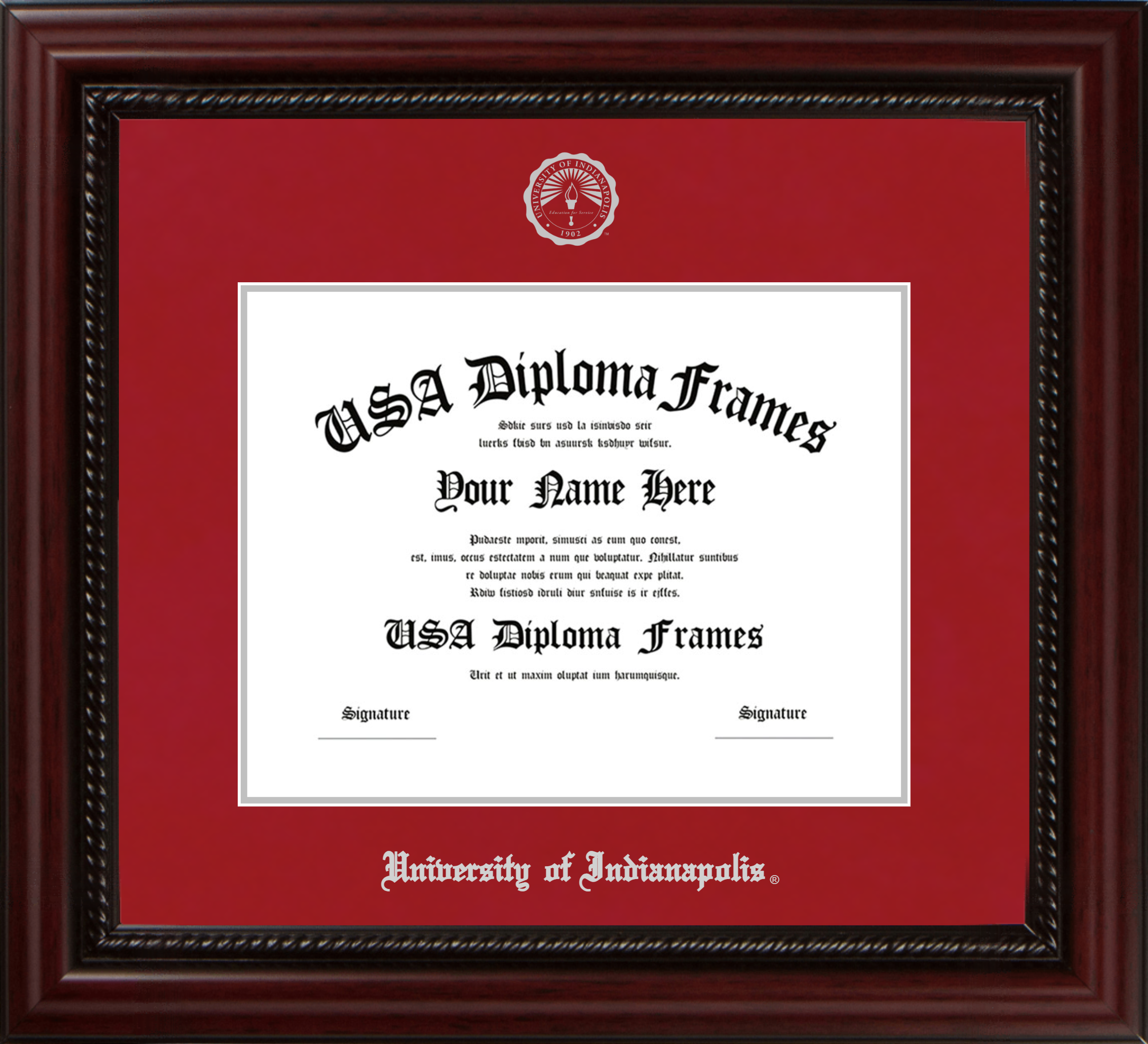University of Indianapolis – Single Horizontal Document ( Diploma ) – Executive Cherry Rope – Crimson Mat – Silver Accent Mat – With Seal(University Seal Silver) – With Silver Embossing (University of Indianapolis)