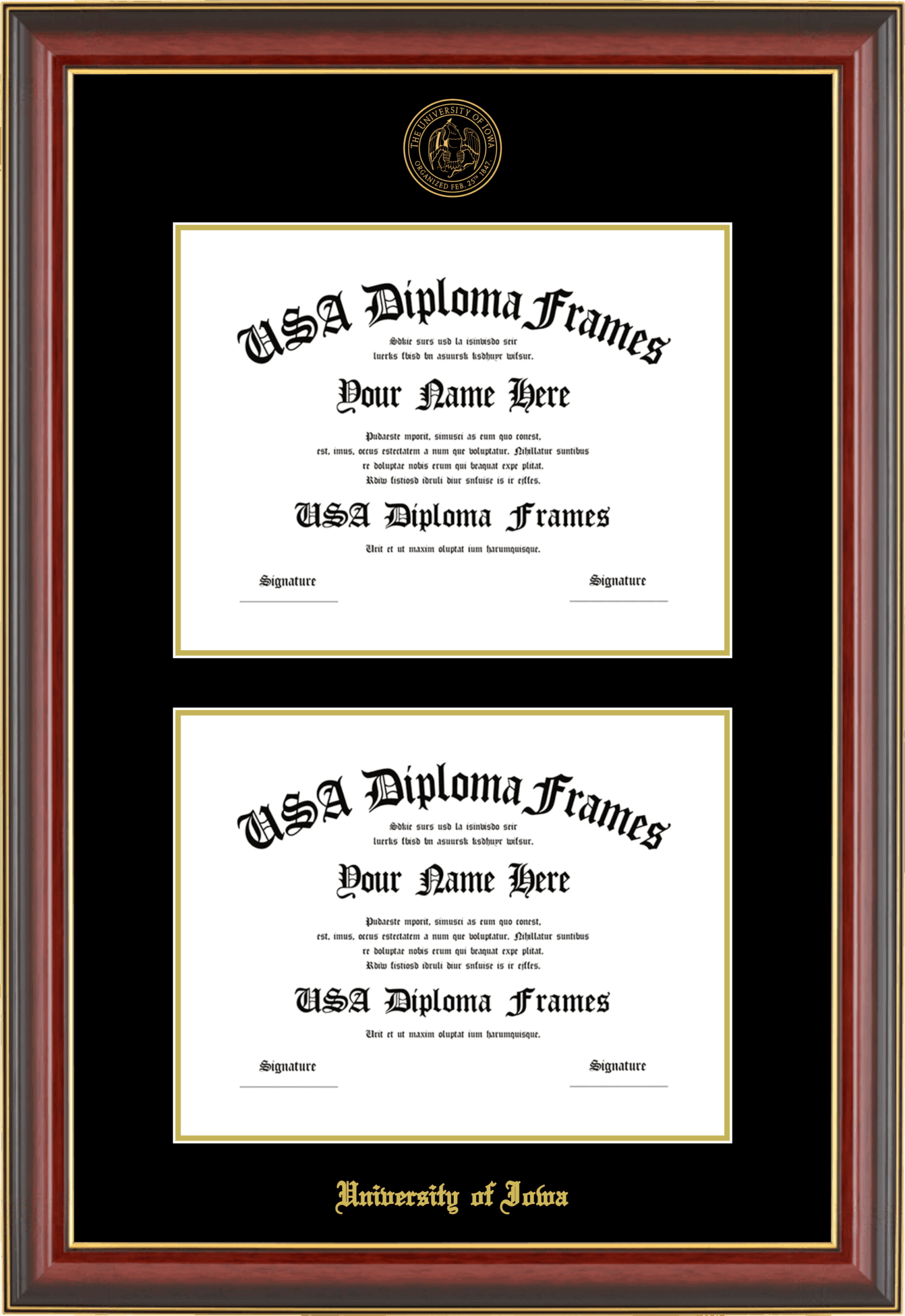 University of Iowa Double Diploma Frame – Double Document – Cherry Mahogany Gold Trim Glossy – Black and Gold Mat