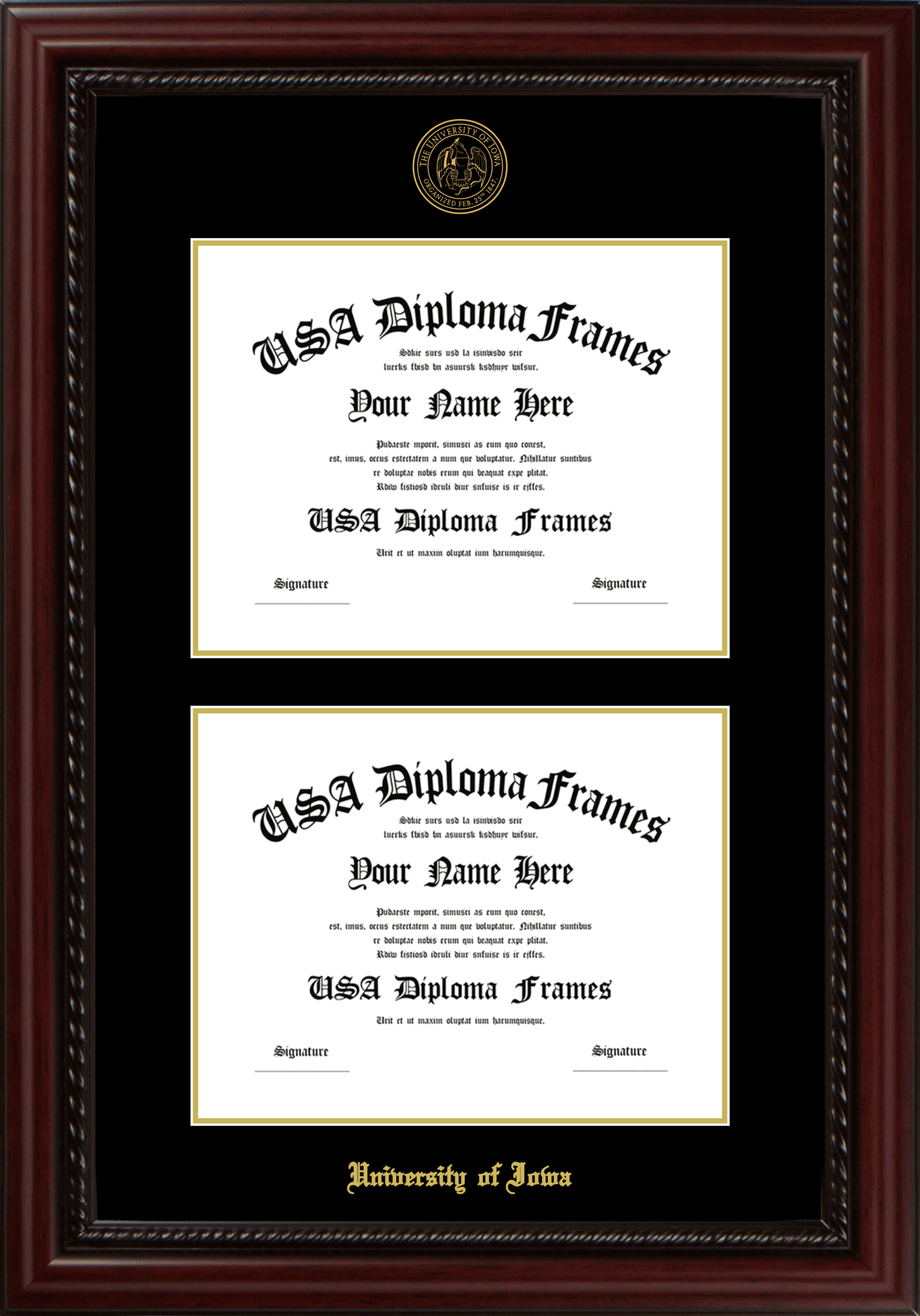 University of Iowa Double Diploma Frame – Double Document – Executive Cherry Rope – Black and Gold Mat