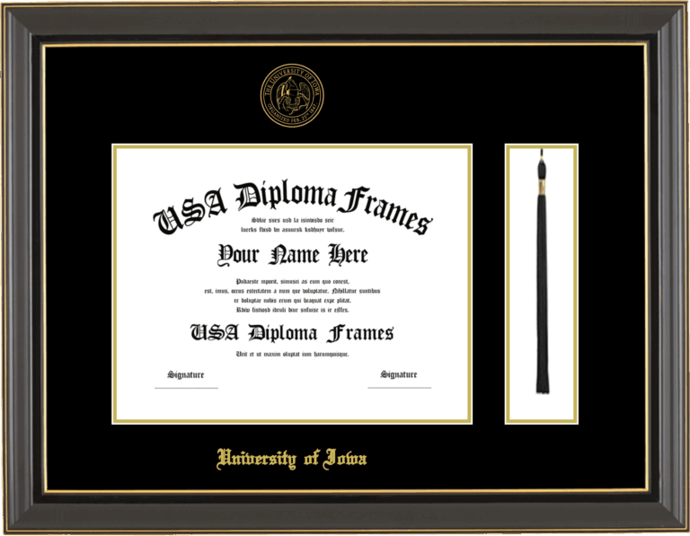 University of Iowa Diploma Frame with Tassel – Black Gold Trim Glossy – Black and Gold Mat