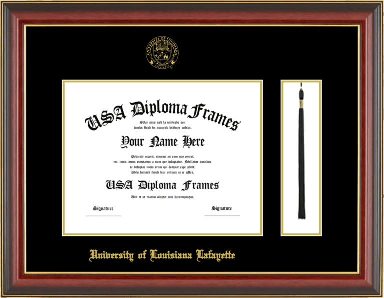 University of Louisiana at Lafayette Diploma Frame with Tassel – Cherry Mahogany Gold Trim Glossy – Black and Gold Mat