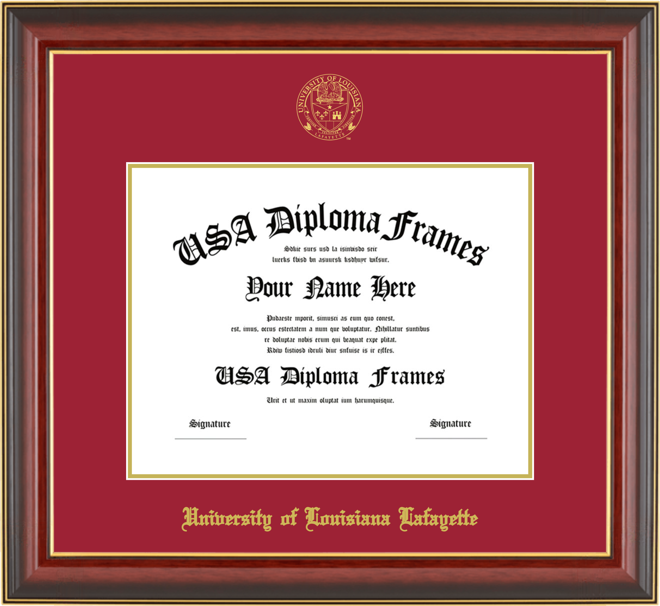 University of Louisiana at Lafayette Diploma Frame – Cherry Mahogany Gold Trim Glossy – Crimson and Gold Mat