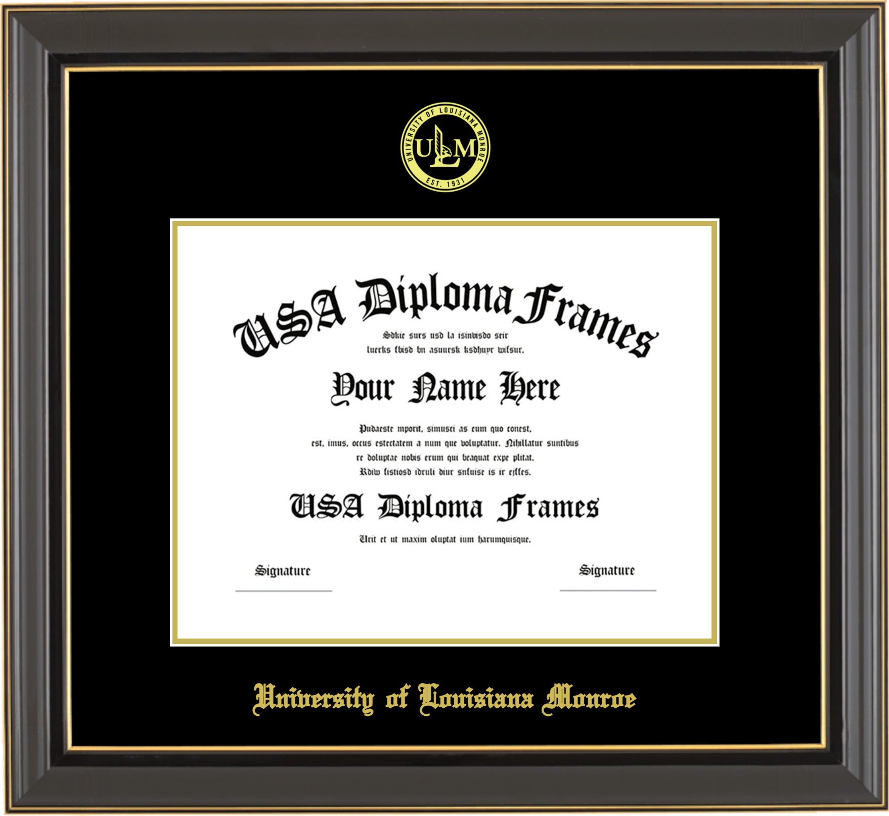 University of Louisiana at Monroe Diploma Frame – Black Gold Trim Glossy – Black and Gold Mat