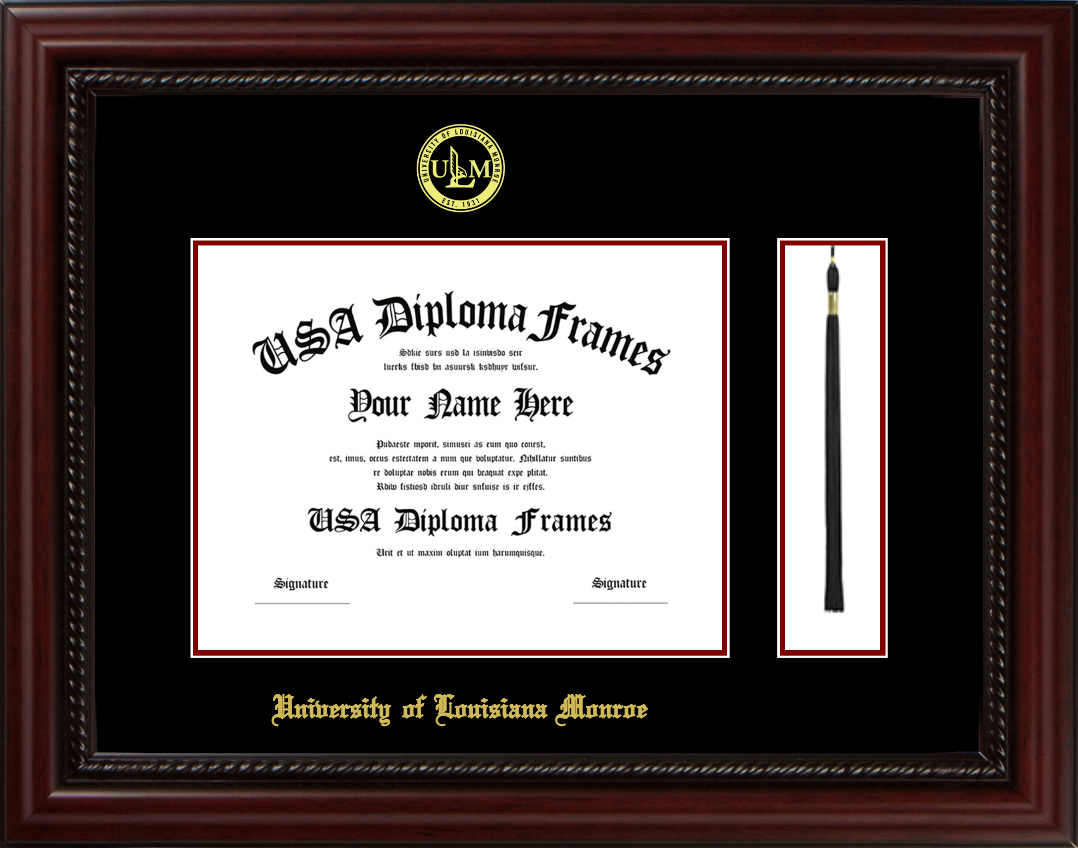 University of Louisiana at Monroe Diploma Frame with Tassel – Executive Cherry Rope – Black and Maroon Mat