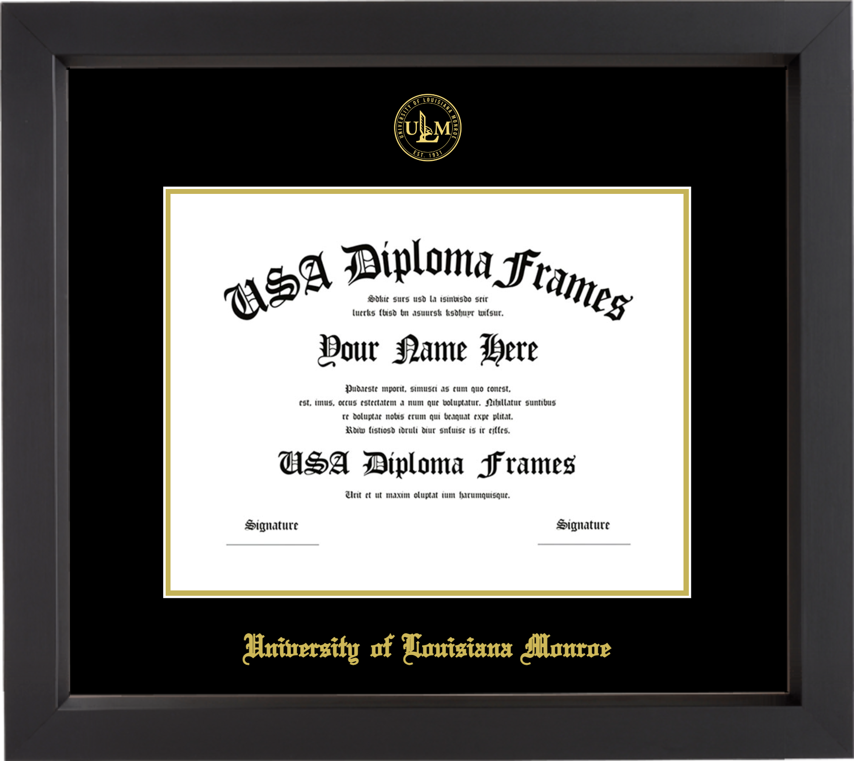 University of Louisiana at Monroe Diploma Frame – Black Matte – Black and Gold Mat