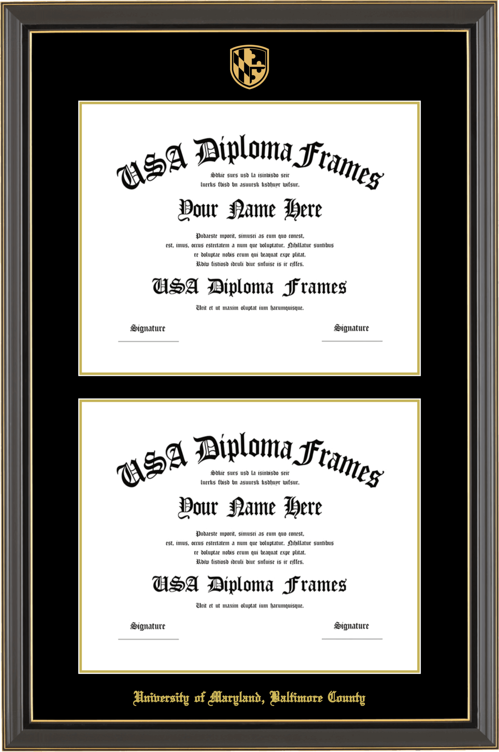 University of Maryland, Baltimore County Double Diploma Frame – Double Document – Black Gold Trim Glossy – Black and Gold Mat