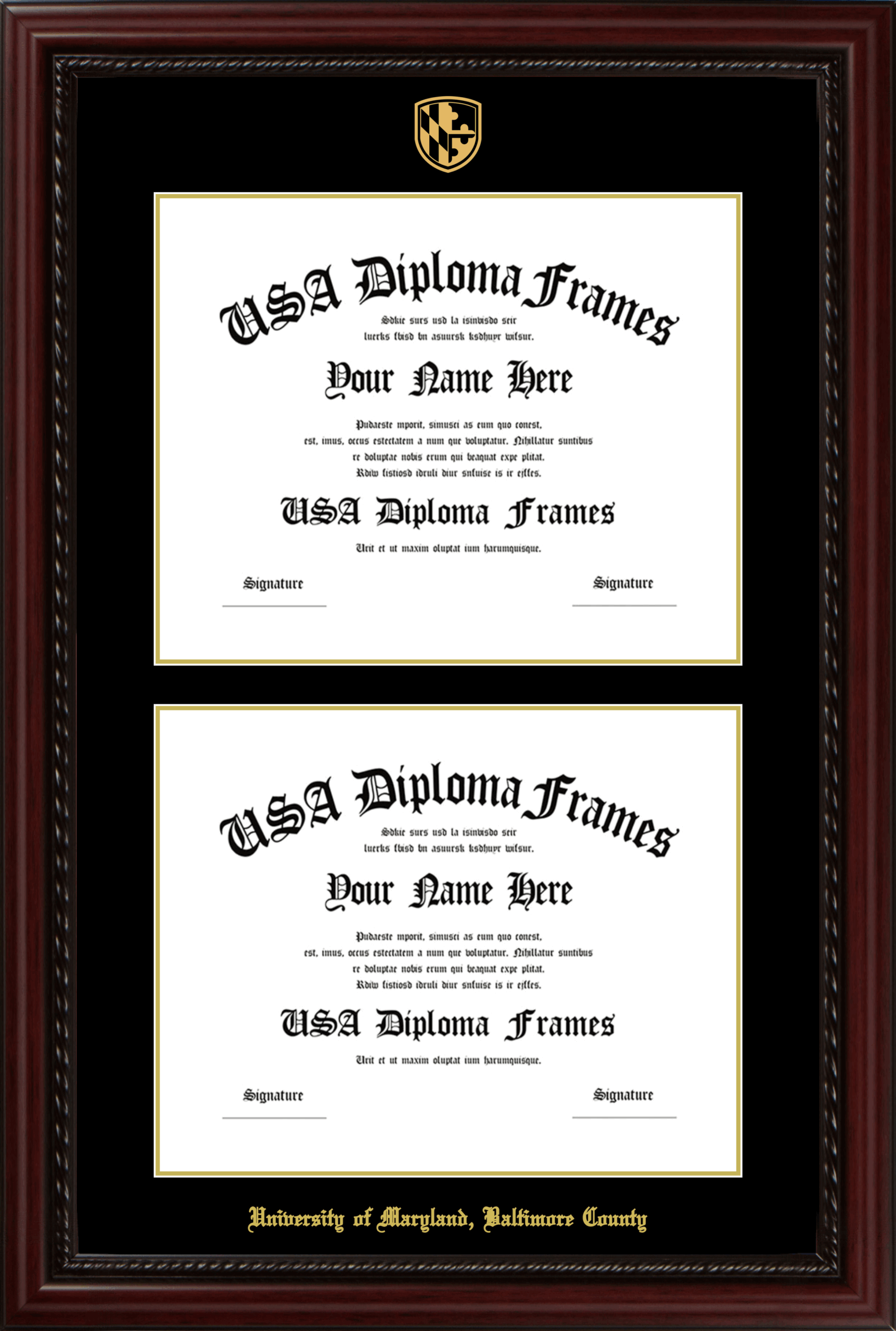 University of Maryland, Baltimore County Double Diploma Frame – Double Document – Executive Cherry Rope – Black and Gold Mat