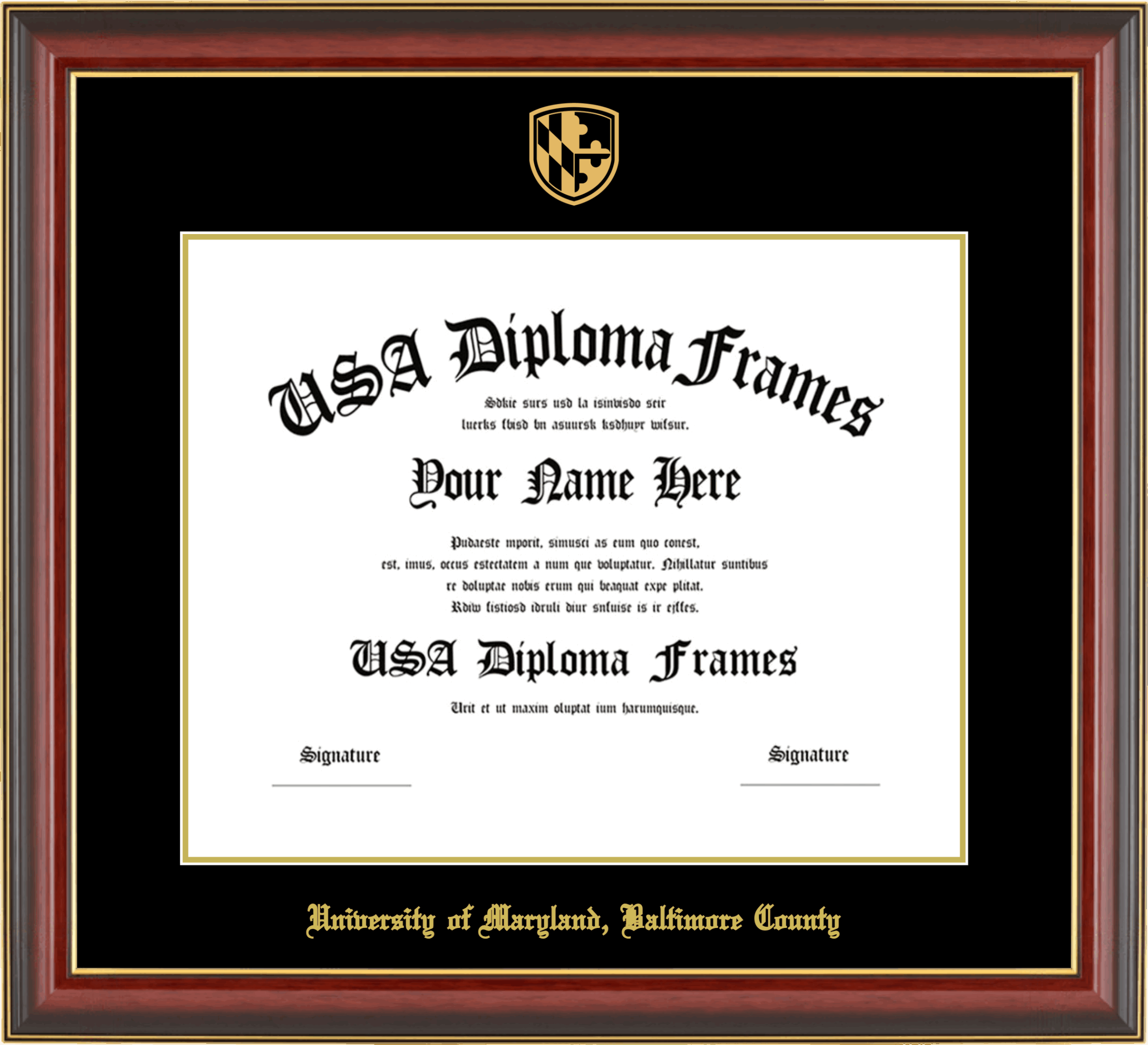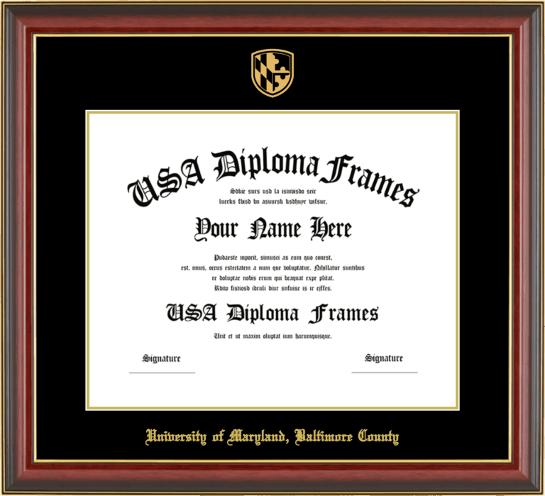 University of Maryland, Baltimore County Diploma Frame – Cherry Mahogany Gold Trim Glossy – Black and Gold Mat