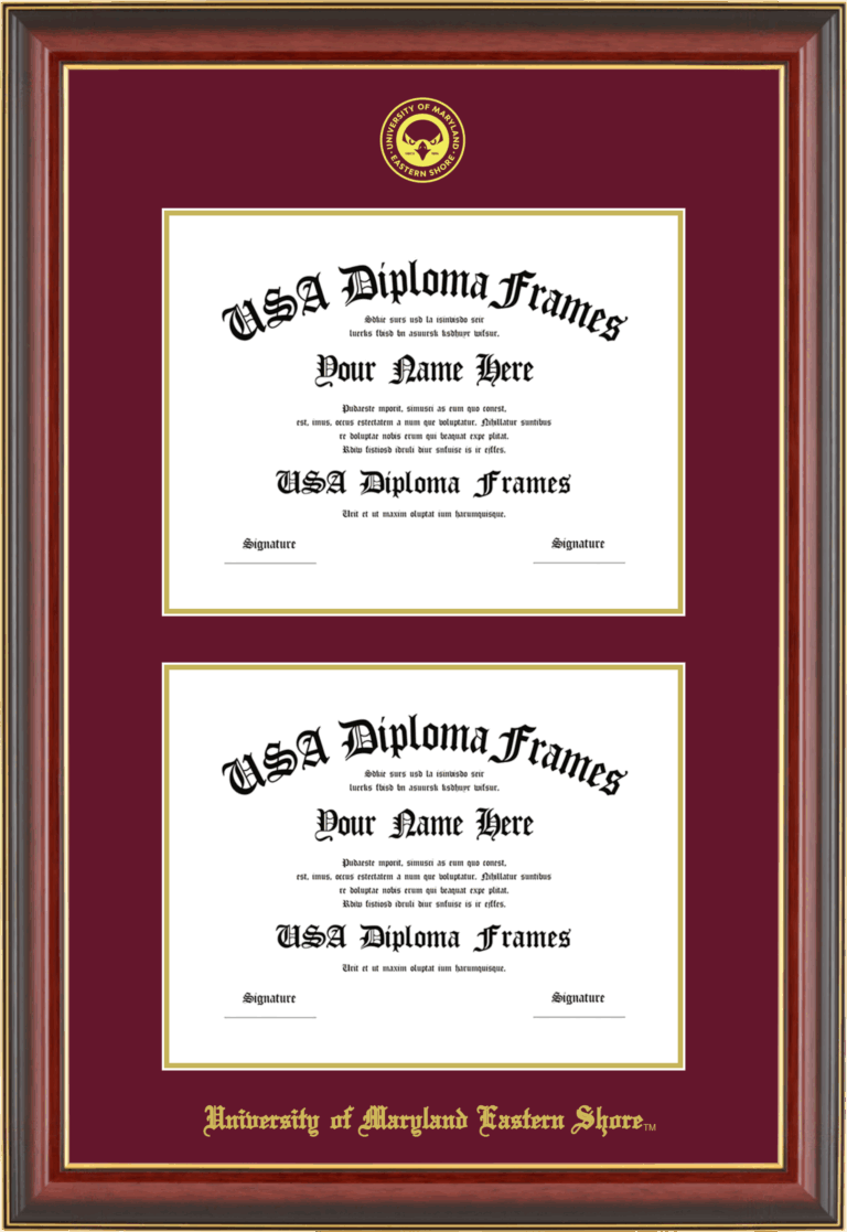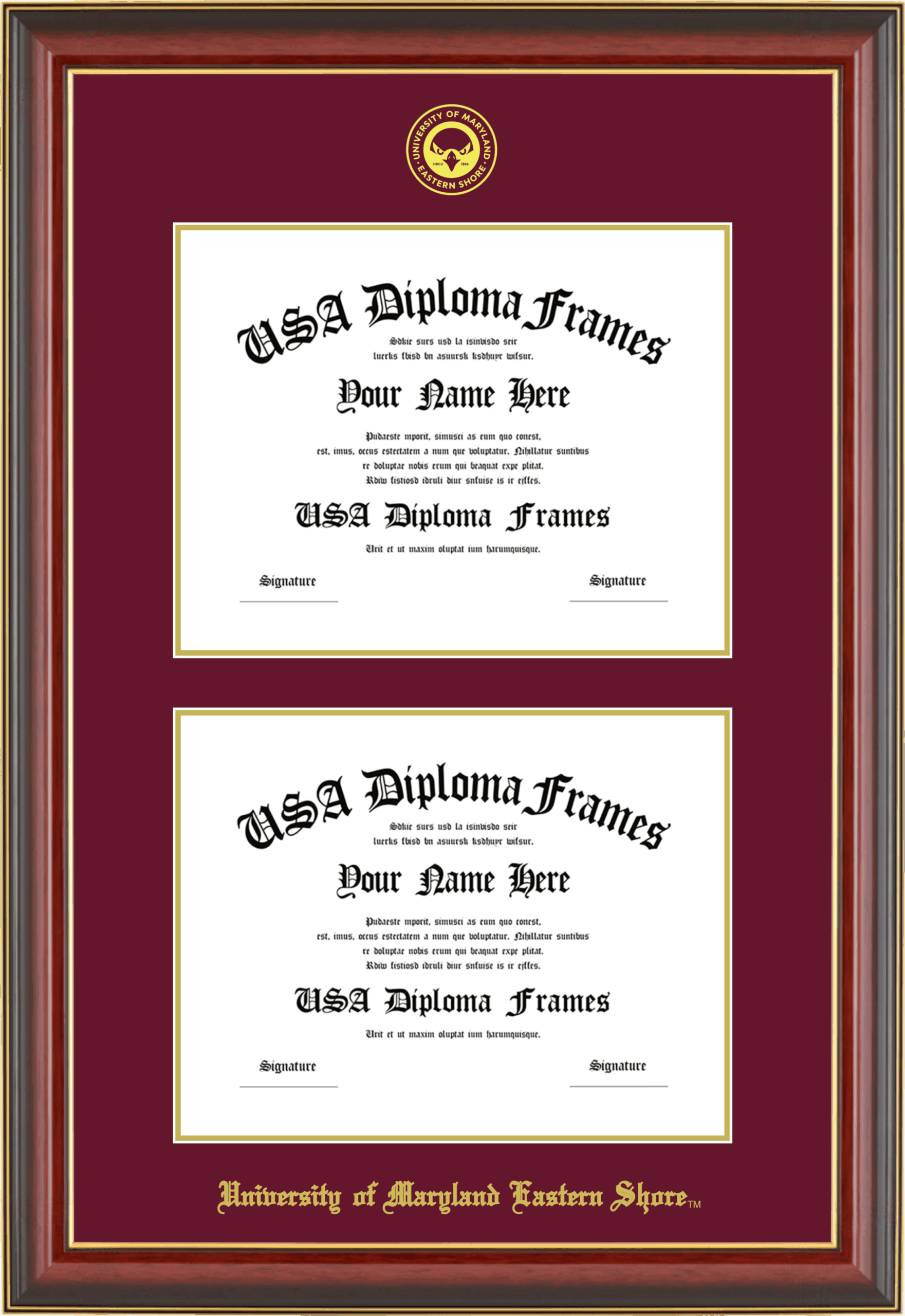 University of Maryland Eastern Shore Double Diploma Frame – Double Document – Cherry Mahogany Gold Trim Glossy – Maroon and Gold Mat