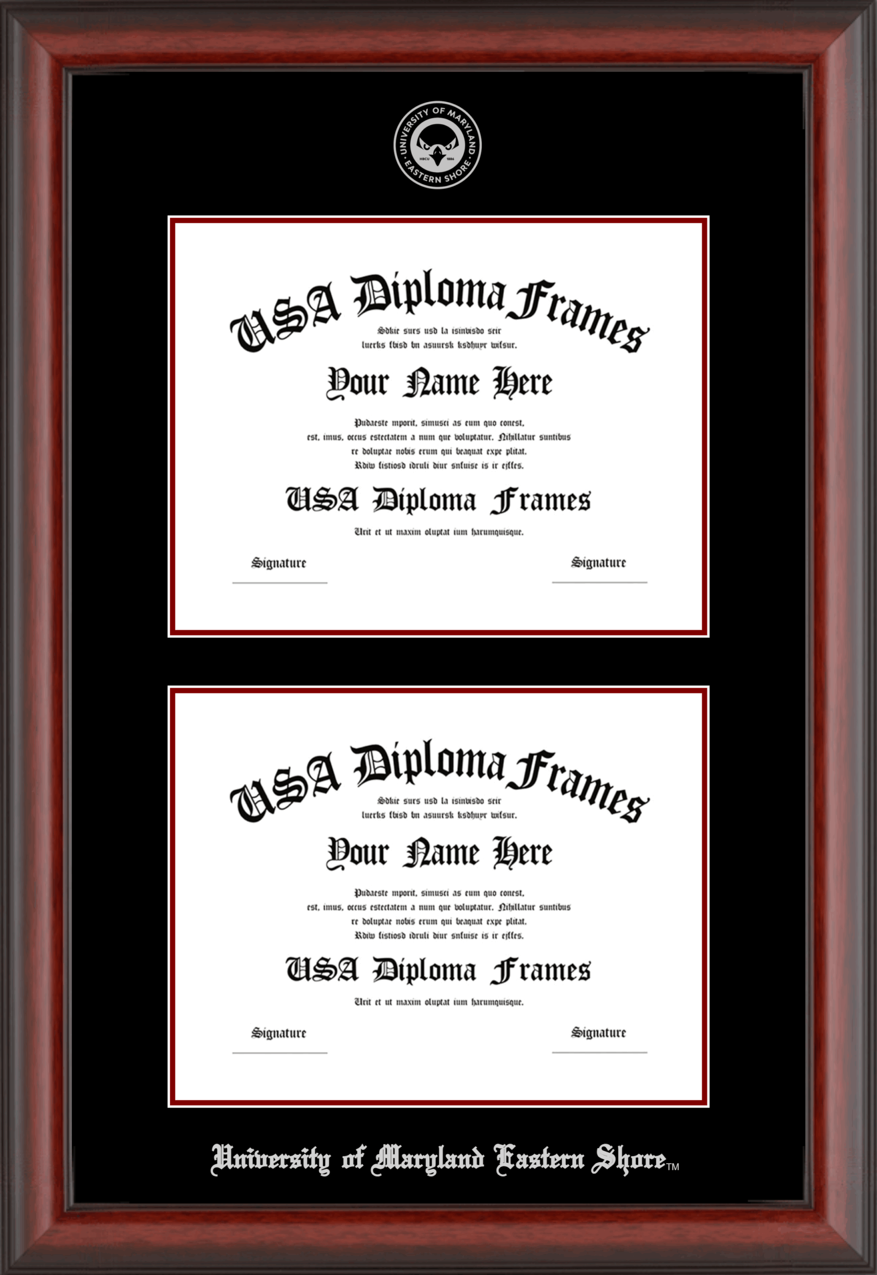 University of Maryland Eastern Shore Double Diploma Frame – Double Document – Cherry Mahogany Matte – Black and Maroon Mat