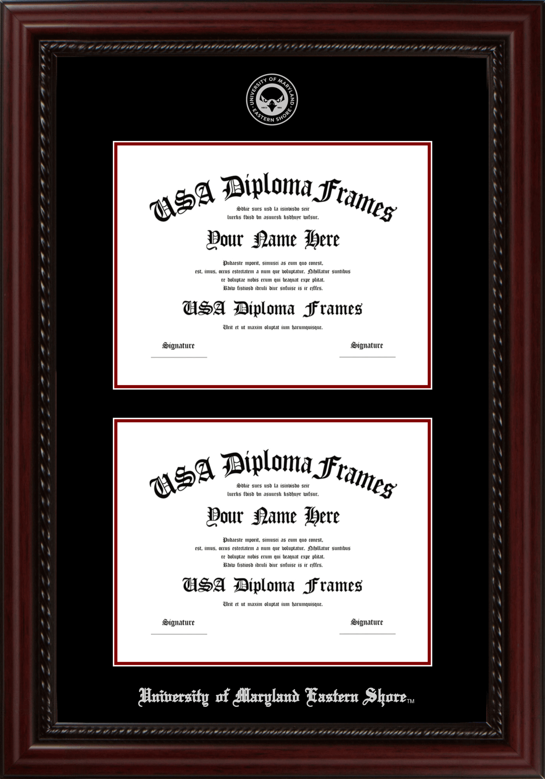 University of Maryland Eastern Shore Double Diploma Frame – Double Document – Executive Cherry Rope – Black and Maroon Mat – Silver Seal