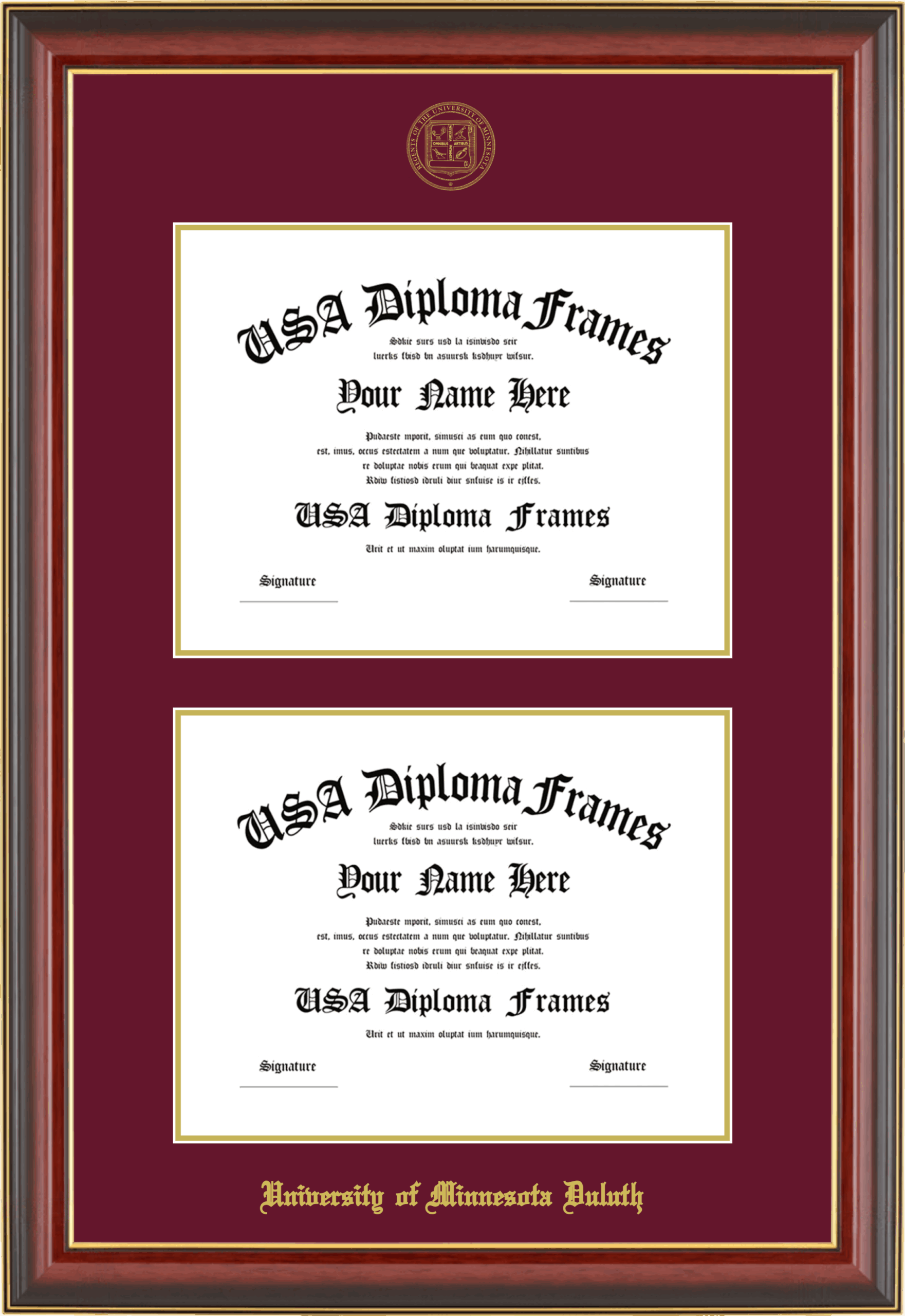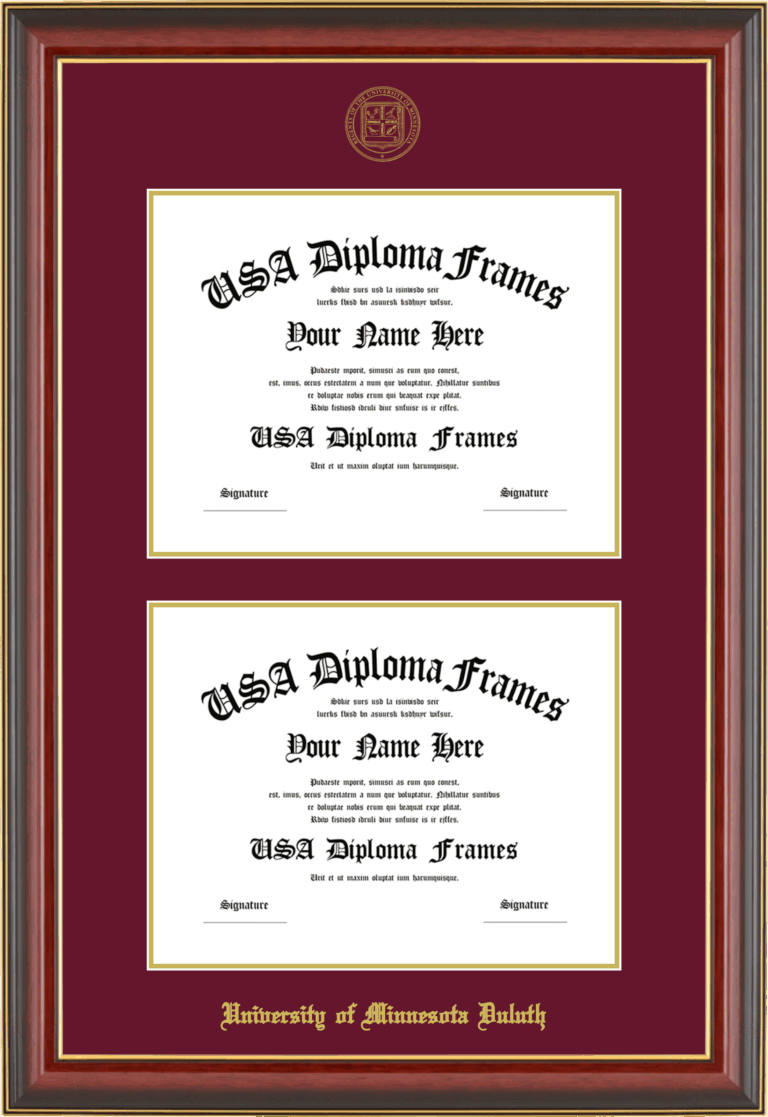 University of Minnesota Duluth Double Diploma Frame – Double Document – Cherry Mahogany Gold Trim Glossy – Maroon and Gold Mat