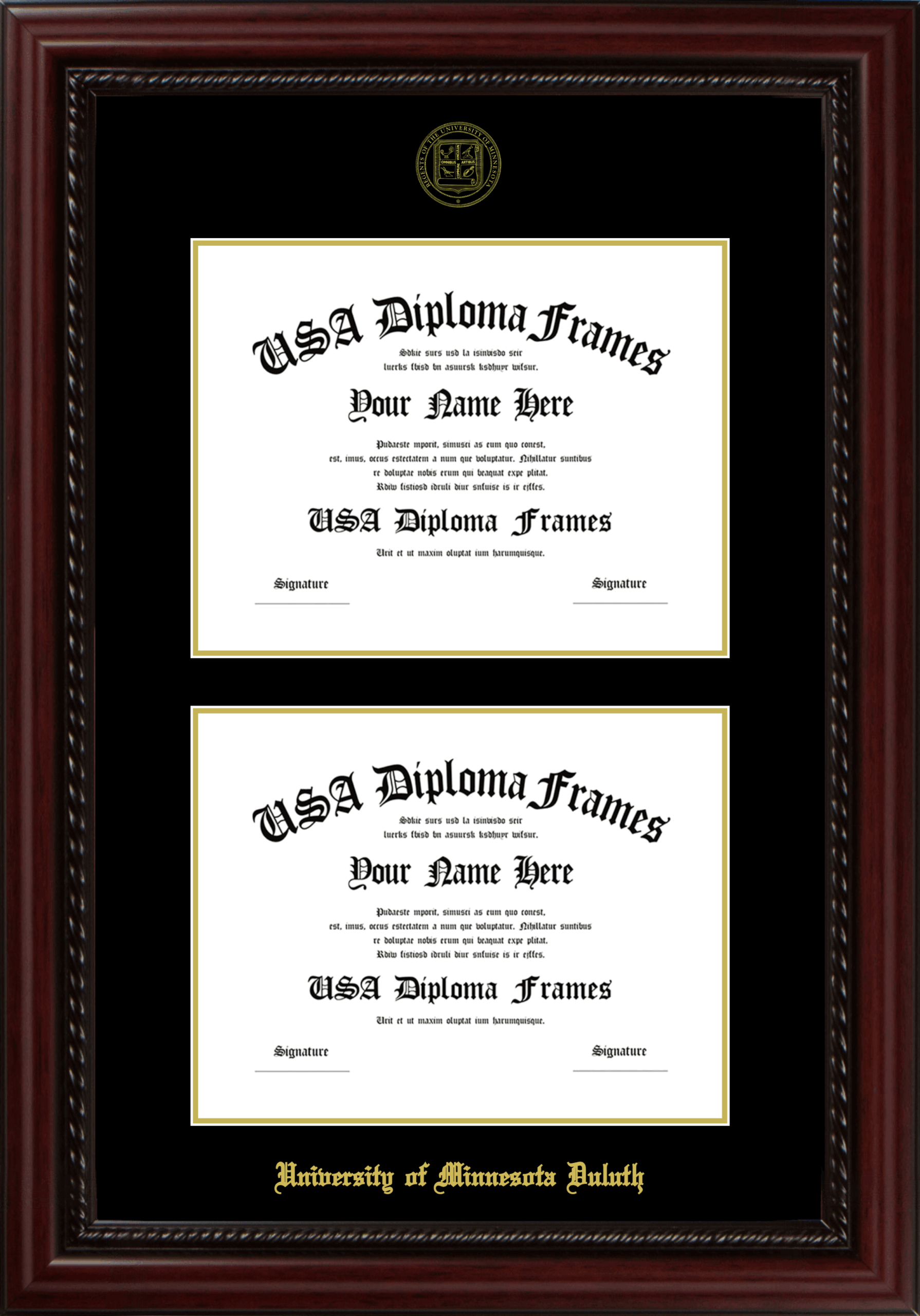 University of Minnesota Duluth Double Diploma Frame – Double Document – Executive Cherry Rope – Black and Gold Mat