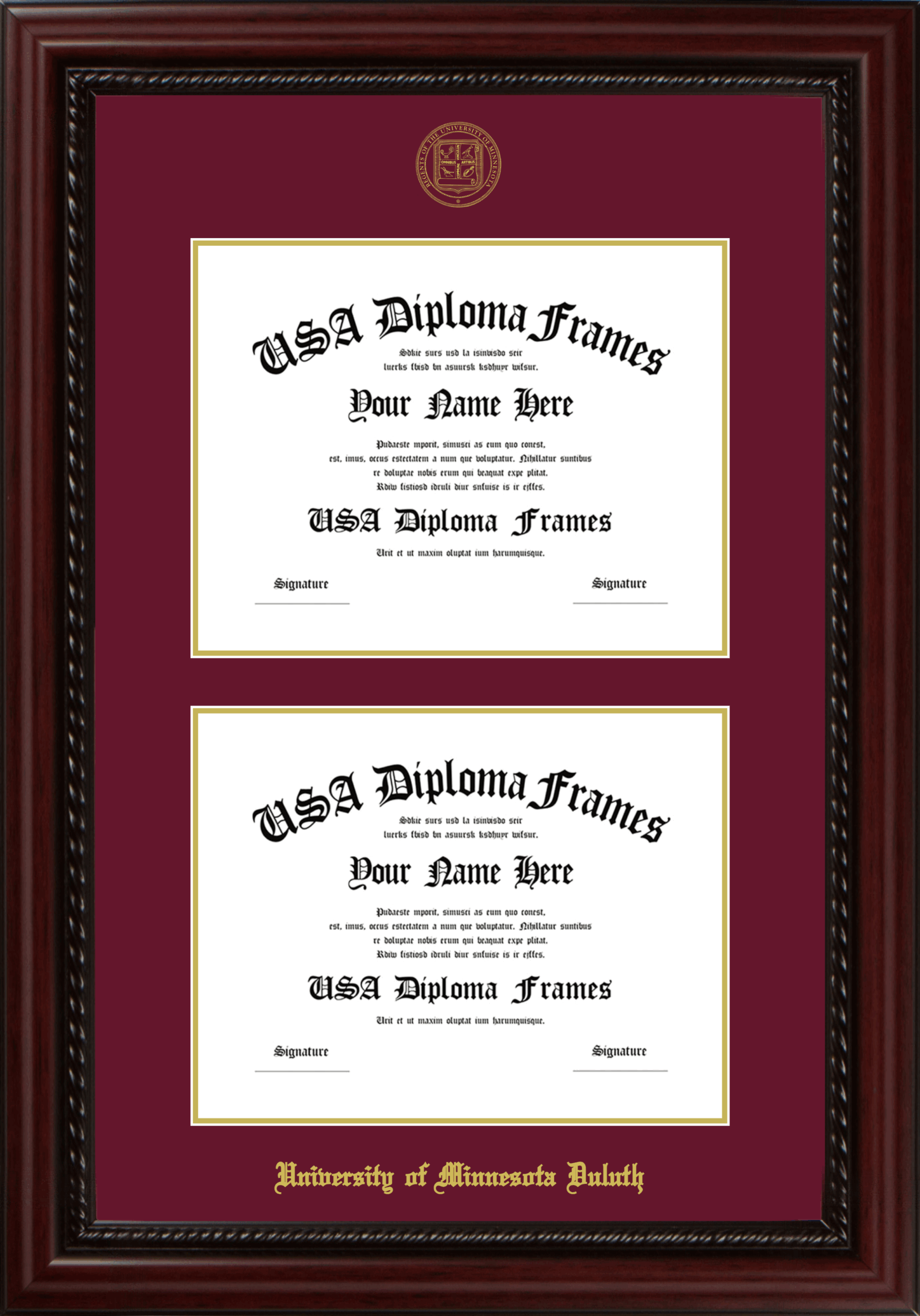 University of Minnesota Duluth Double Diploma Frame – Double Document – Executive Cherry Rope – Maroon and Gold Mat