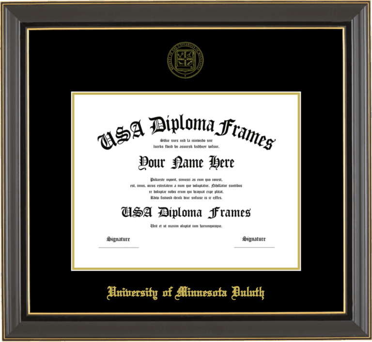 University of Minnesota Duluth Diploma Frame – Black Gold Trim Glossy – Black and Gold Mat