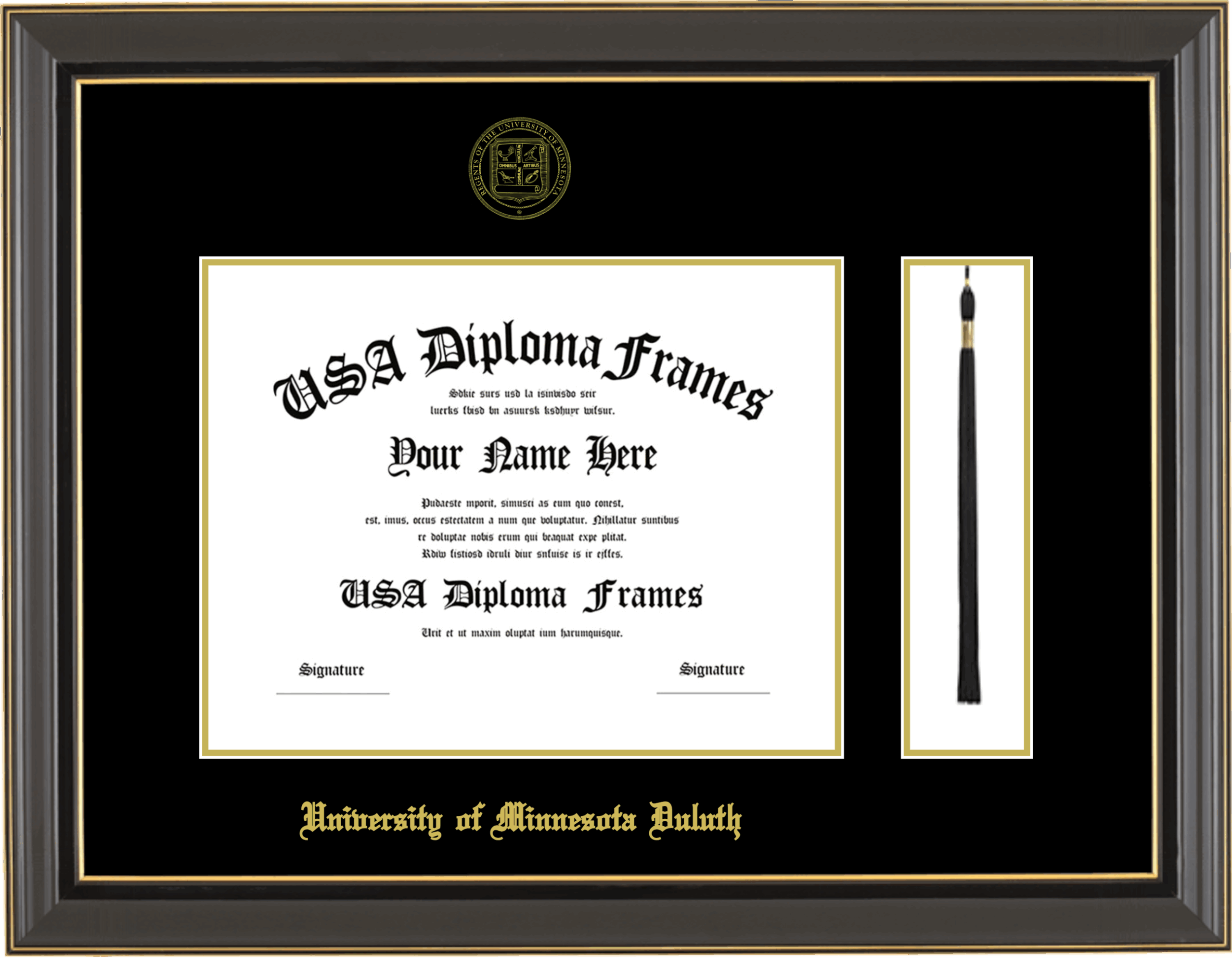 University of Minnesota Duluth Diploma Frame with Tassel – Black Gold Trim Glossy – Black and Gold Mat